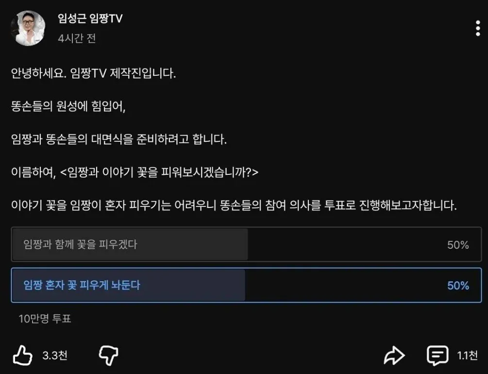 [배꼽의행방]실시간 구독자들한테 삐진 임짱 근황 ㅋㅋㅋㅋㅋㅋㅋ.JPG 작성자걸스제네레이션위돈스탑|작성시간26.01.09|조회수72,036 목록 댓글 32 글자크기 작게가 글자크기 크게가 출처: 여성시대 (임짱티비) 구독자들이 혼자 꽃 피우게 놔둔다 투표해서 삐짐ㅋㅋㅋ 다음검색 현재 게시글 추가 기능 열기 북마크 공유하기 신고 센터로 신고 댓글 댓글 32 댓글쓰기 답글쓰기 댓글 리스트 작성자씨보레 | 작성시간 26.01.09 아 ㅋㅋㅋㅋㅋㅋㅋㅋㅋㅋㅋㅋㅋ개웃기네 작성자파란옷이젤다 | 작성시간 26.01.09 개웃기넼ㅋㅋㅋㅋㅋㅋㅋㅋㅋㅋㅋㅋ 작성자고기사랑 | 작성시간 26.01.10 이미지 확대 답댓글 작성자고기사랑 | 작성시간 26.01.10 저거 이후 게시글 댓글이 개웃김 진짜 ㅋㅋㅋㅋㅋ 이미지 확대 작성자우리는트레블러 | 작성시간 26.01.12 개웃겨ㅠ 댓글 전체보기
