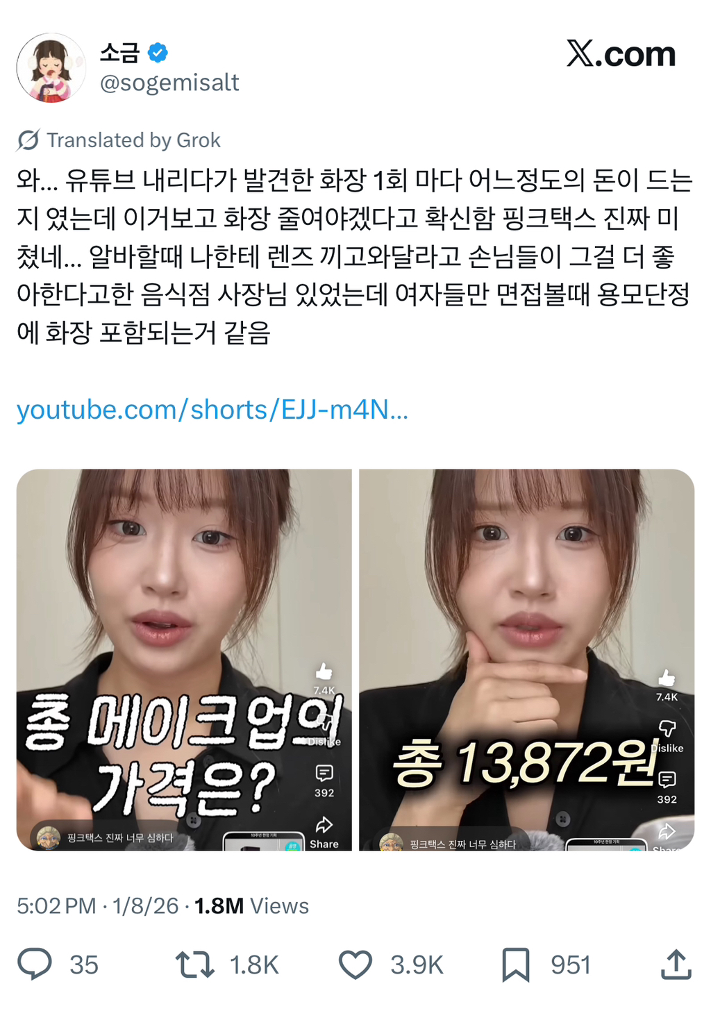 작성자뚜뚜빔 작성시간 26.01.09 수정화장비까지따지면 화장하는여자는 한달30일기준최소45만원더쓰는거