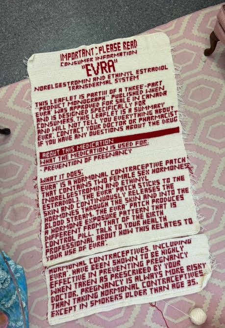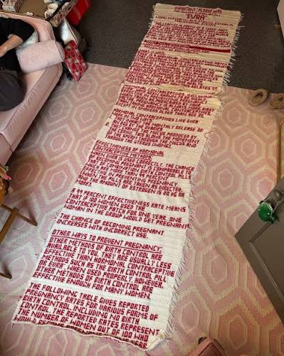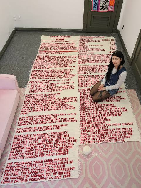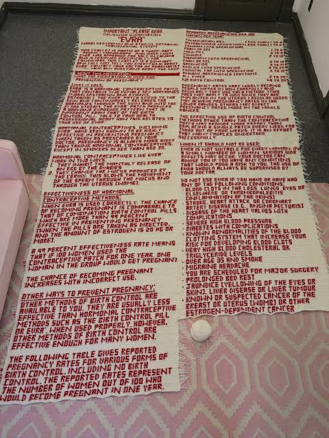 자유, 신체 자율성, 정보에 입각한 동의, 그리고 여성의 권리가 수년 동안 얼마나 열심히 싸웠는지에 대한 논평입니다. 수백만 개의 작은 바늘과 붉은 희생물에서 코바늘로 꿰매어냈는데, 이는 그렇게 빨리 풀릴 수 있습니다. 고통의 역사를 바탕으로 한 부작용 목록보다 더 깊은 이야기입니다. 임신과 출산은 피임보다 수백 배 더 위험하고 불편합니다. 활동가들은 피임에 대한 접근성이 중요한 여성의 권리를 위한 도약을 위해 싸웠고 투옥되었습니다. 현재와 과거를 막론하고 수많은 사람들이 자신의 생물학과 생식을 통제할 권리에 대한 정보를 거부당하고 인권이 직접적이고 잘못된 정보 캠페인을 통해 공격받는 격동의 시대의 기준이 되어 억압적인 상황에 갇혀 있습니다. 미래 세대는 자신의 신체 과학에 대한 모든 단어를 읽고 보호할 권리를 부여받아야 합니다. 그들은 방을 삼키는 12미터 태피스트리에 실타래처럼 그 말이 얼마나 진짜인지 느껴야 합니다.