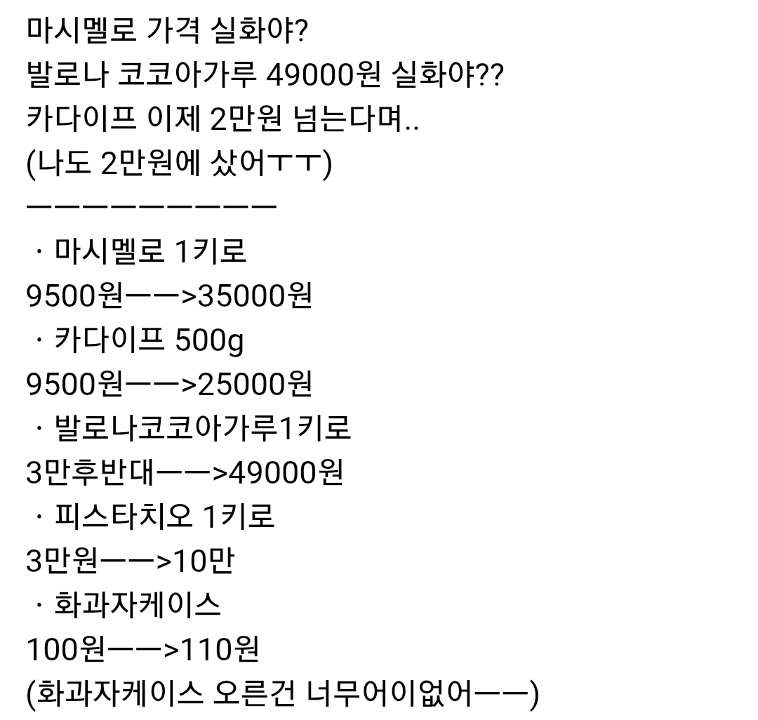 마시멜로 피스타치오는 거의 3배 올랐고 코코아가루마저도 가격이 올라서 코코아 가루 들어가는 메뉴 파는 다른 가게들도 불똥 맞는중