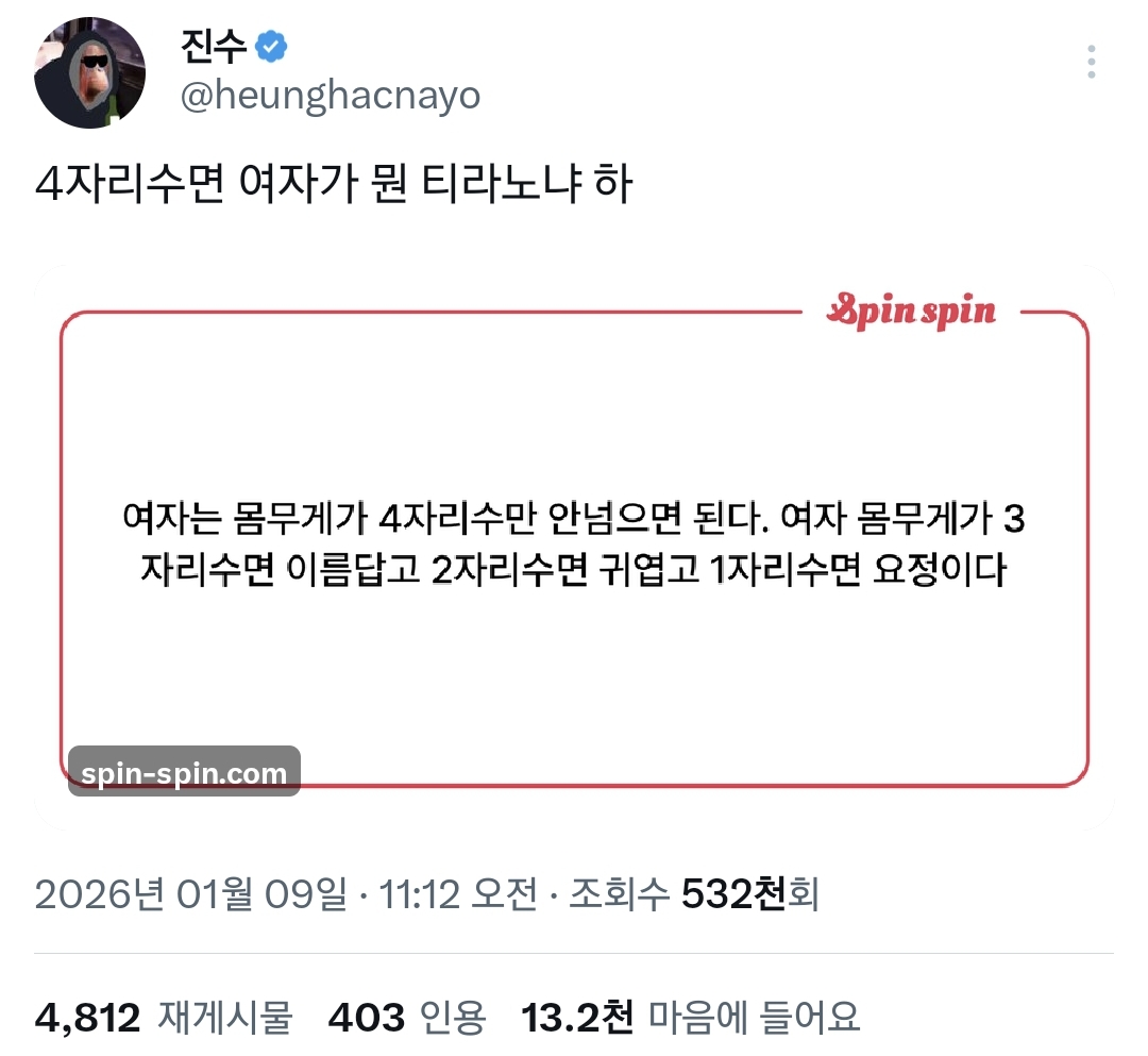[흥미돋]여자는 몸무게가 4자리 수만 안 넘으면 된다.twt 작성자스피또띠아|작성시간26.01.09|조회수25,272 목록 댓글 42 글자크기 작게가 글자크기 크게가 출처: https://x.com/i/status/2009448184649798019 여성시대 스피또띠아ㄹㅇ 2자리수부터는 개말라 다음검색 현재 게시글 추가 기능 열기 북마크 공유하기 신고 센터로 신고 댓글 댓글 42 댓글쓰기 답글쓰기 댓글 리스트 작성자지구야아프지마 | 작성시간 26.01.09 먼ㅋㅋㅋㅋㅋㅋ 작성자이그만제 | 작성시간 26.01.09 1자리수 요정이긴 하겠지 ㅅㅂㅋㅋㅋㅋㅋㅋㅋㅋㅋㅋㅋㅋㅋㅋㅋㅋ 작성자불면볶음닭 | 작성시간 26.01.09 나 귀엽네 작성자JPTW | 작성시간 26.01.09 990키로 이상 찌게 되면 그때부터 관리해야겠다~! 작성자눓엉이 | 작성시간 26.01.09 요정….같긴 하지 ㅋㅋㅋㅋㅋㅋㅋ 아무래도 댓글 전체보기