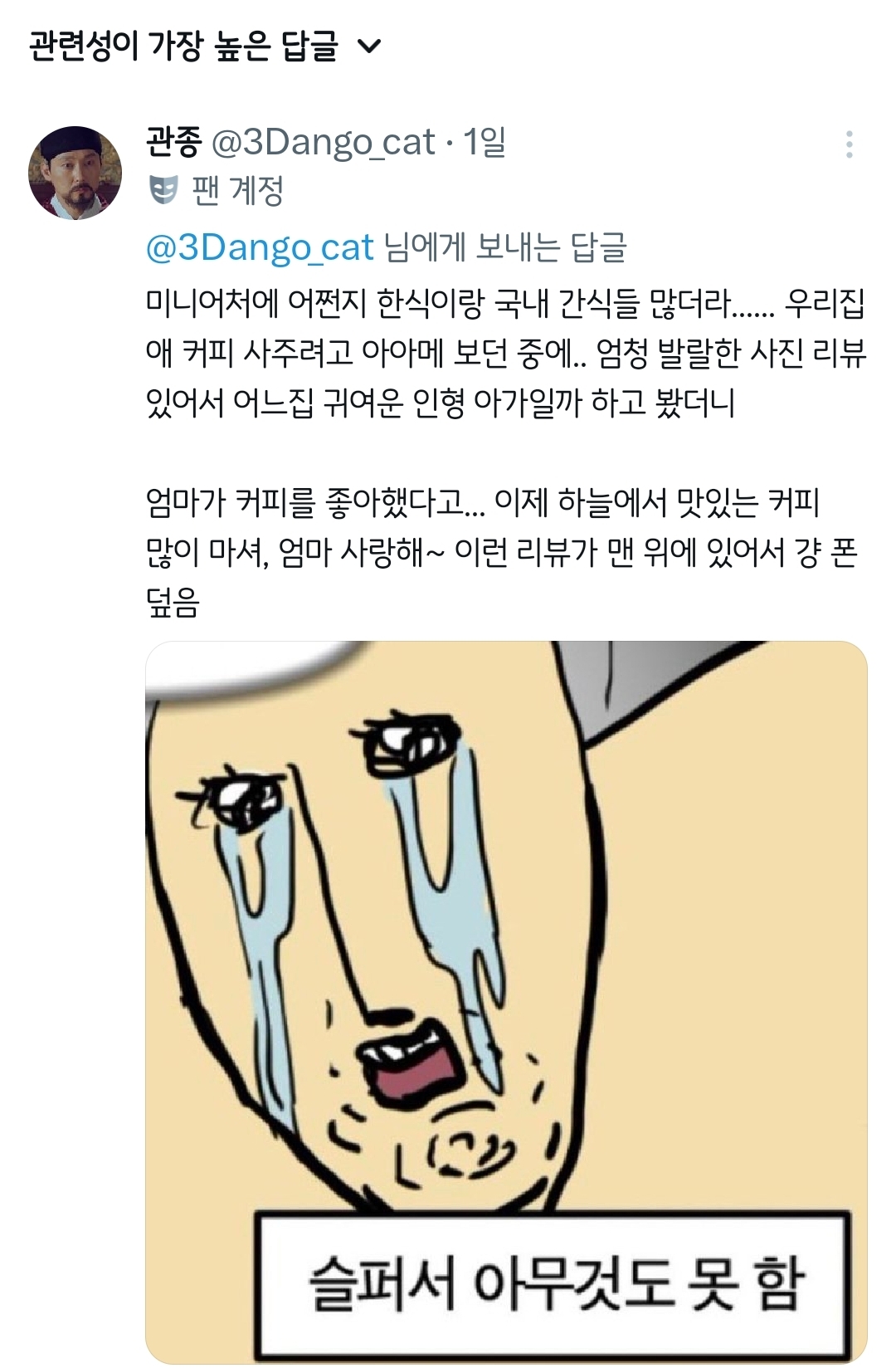 작성자나주보리굴비 작성시간 26.01.09 우리 엄마는 아빠 돌아가시고 4년째인데 매주 납골당에 찾아가시는 중이거든 근데 사진보다 좋을거같아서 덕질할때 만들었던 아크릴 등신대로 아빠 넣어놨더니 너무 좋아하심