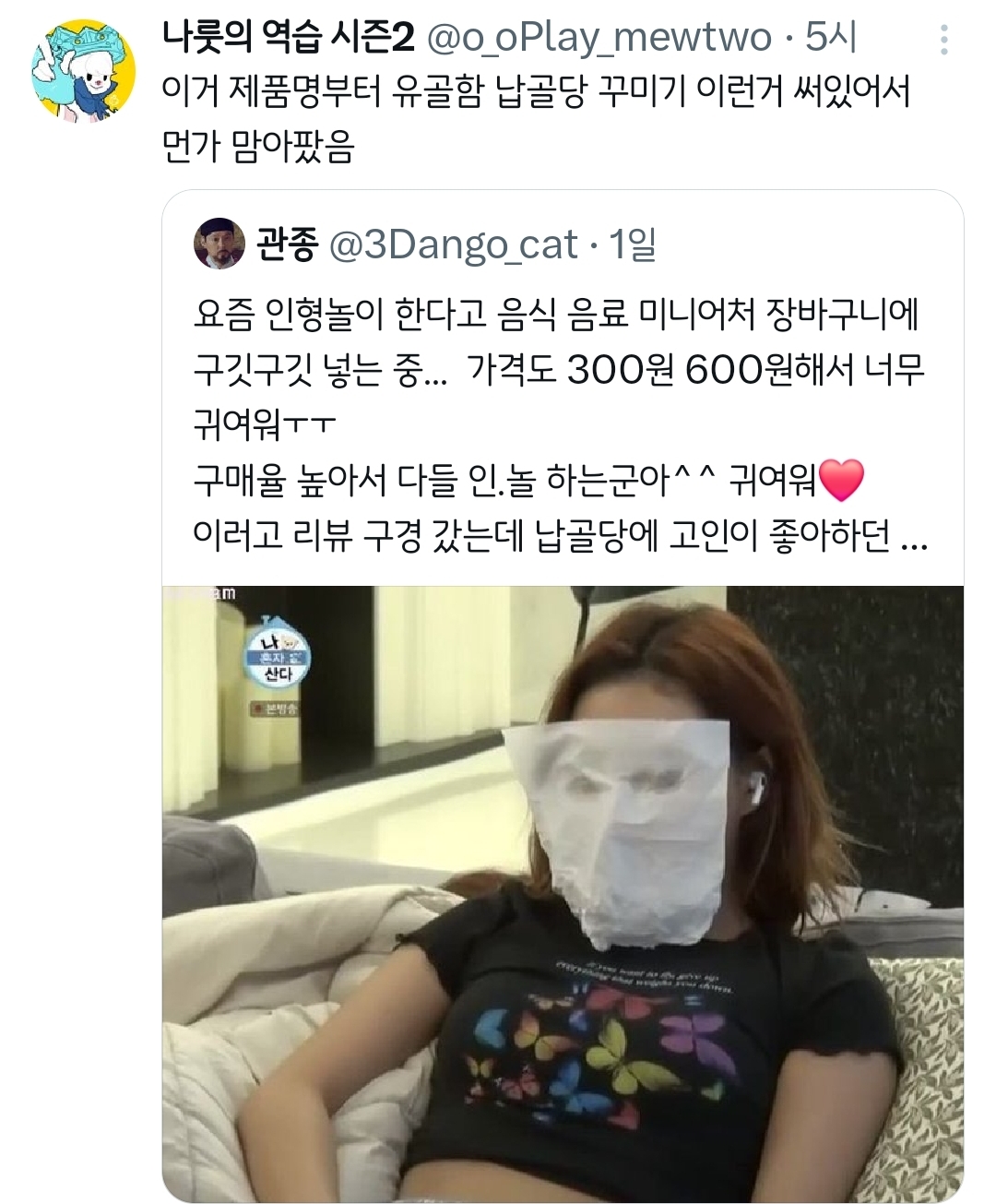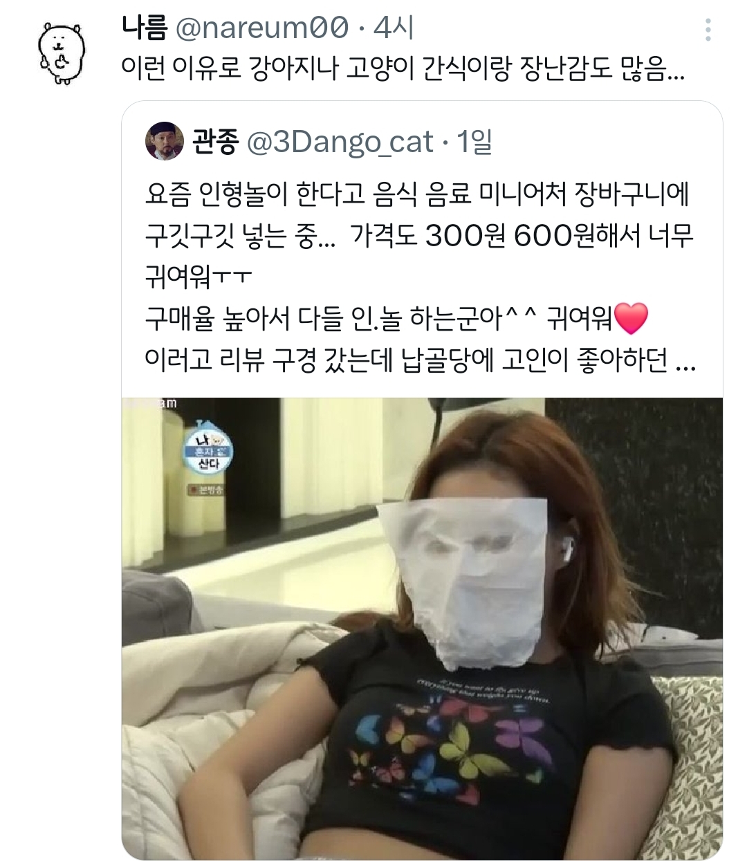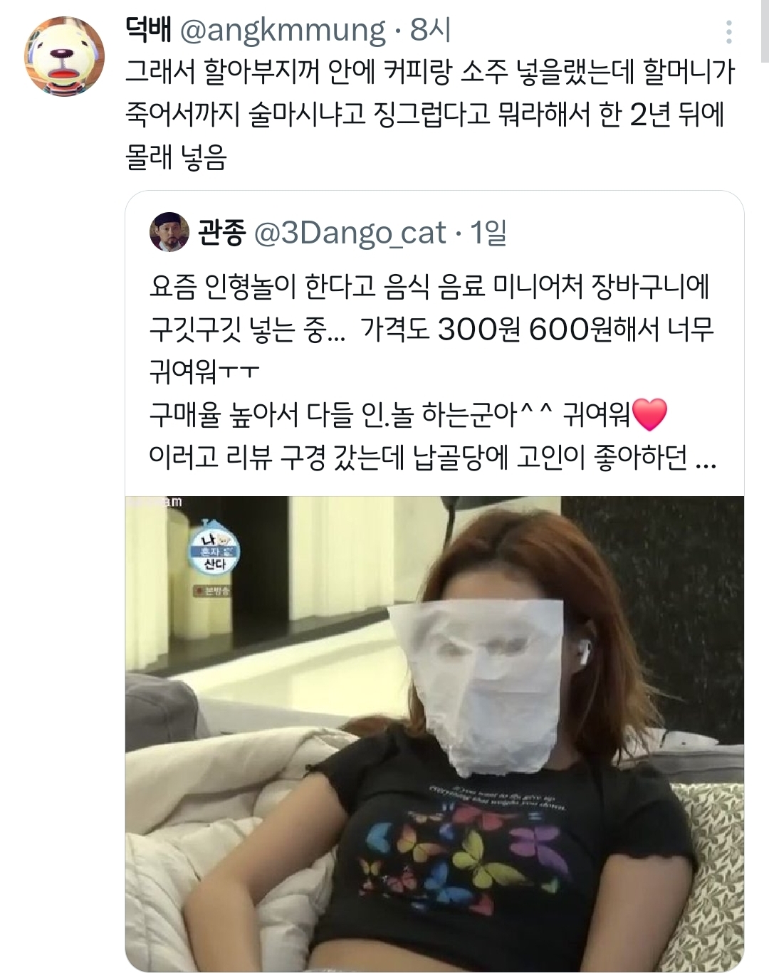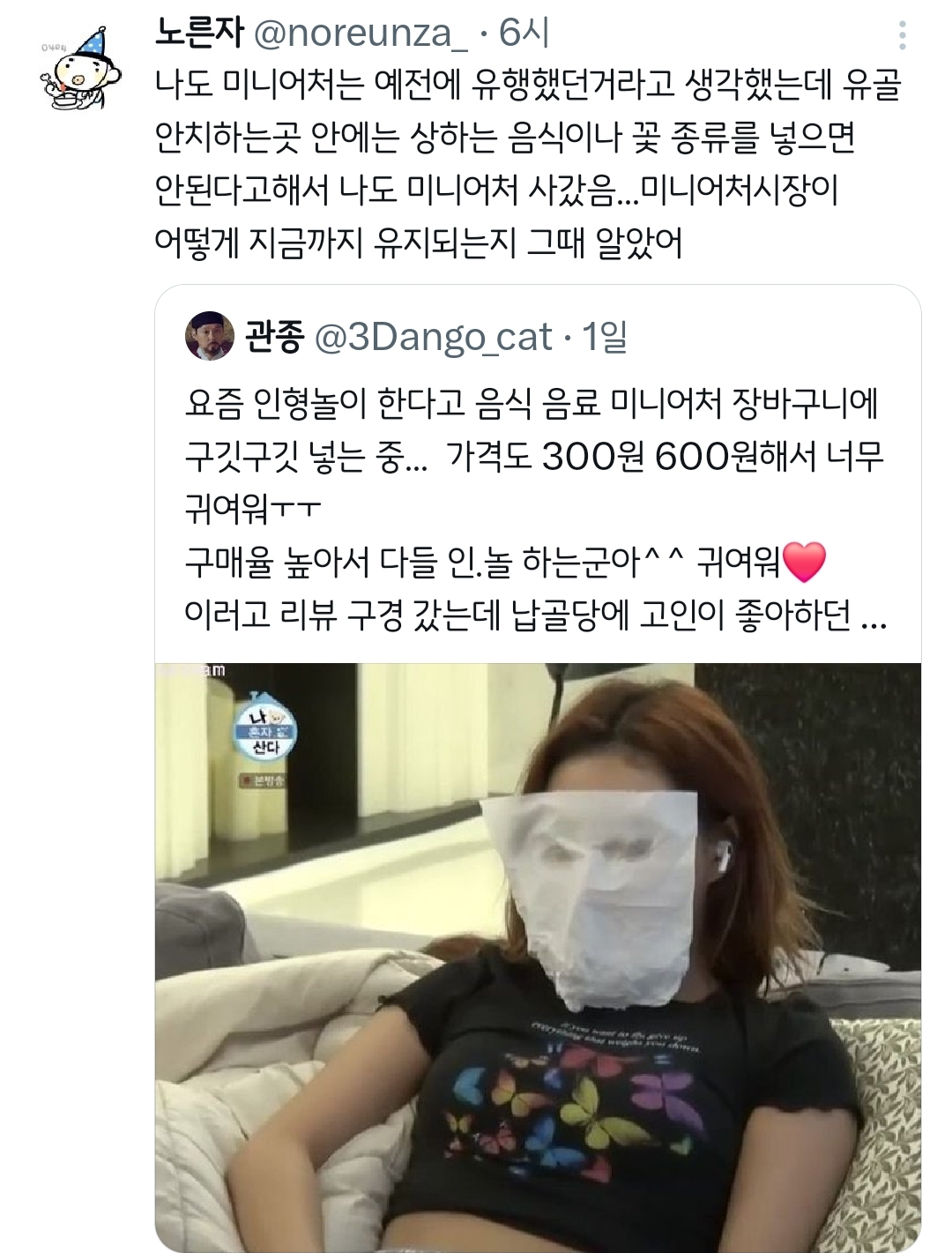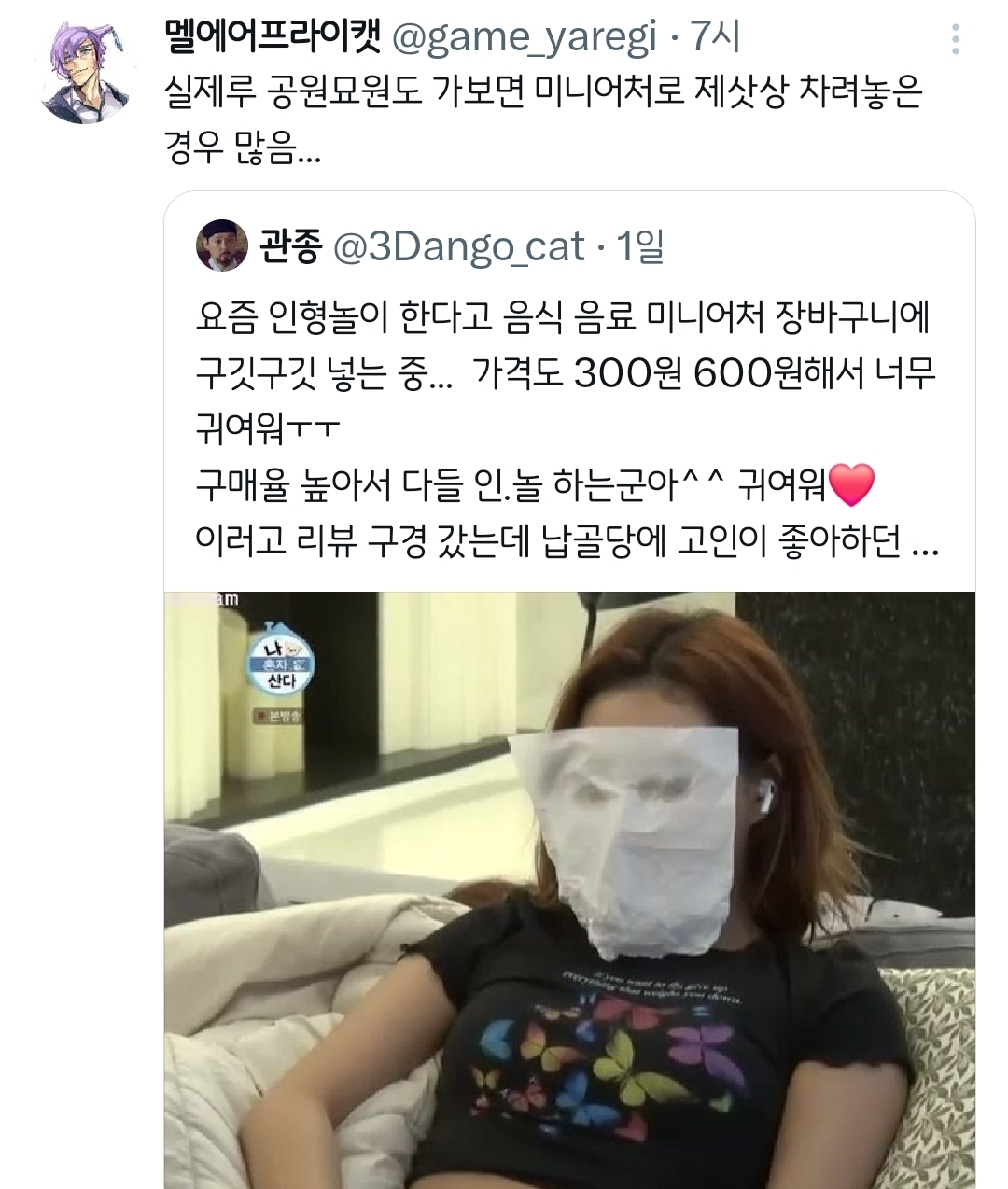 작성자후리럇차 작성시간 26.01.09 납꾸 나름 재밌더라(?) ㅋㅋㅋㅋㅋㅋㅋ 보는 것두... 다만 이제 슬픈 건 너무 어린 애들이 일찍 간 거 볼 때ㅠ 유난히 더 귀엽고 반짝이는 미니어쳐들이랑 인형이 많음