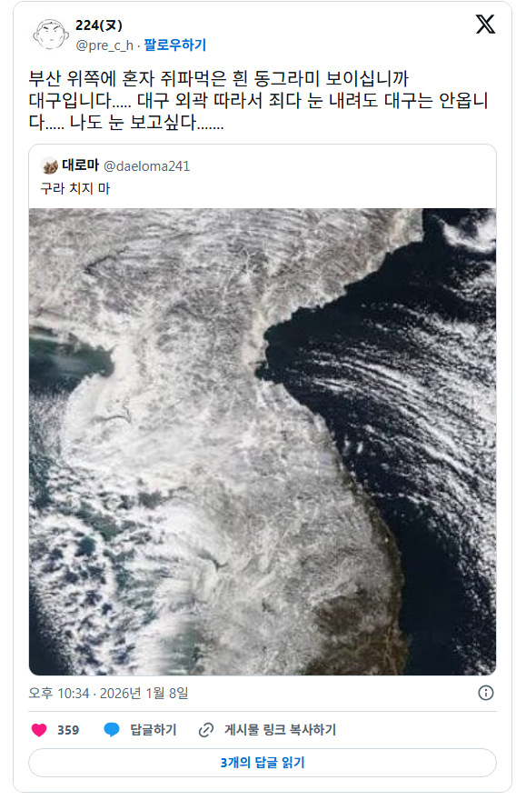 [흥미돋]대구와 부산은 눈이 잘 안 온다고.. 작성자딜런댈런|작성시간26.01.09|조회수10,357 목록 댓글 9 글자크기 작게가 글자크기 크게가 출처: https://theqoo.net/hot/4056012486 캡쳐사진 누르면 트위터로 이동 눈이 보고 싶은 대구시민 다음검색 현재 게시글 추가 기능 열기 북마크 공유하기 신고 센터로 신고 댓글 댓글 9 댓글쓰기 답글쓰기 댓글 리스트 작성자우러유르누흐라우 | 작성시간 26.01.09 와 엉따 성능 좋네 작성자타순이야마카다 | 작성시간 26.01.09 엉따래 귀엽다 작성자크라임씬리턴즈 | 작성시간 26.01.09 ㅋㅋㅋ엉따ㅋㅋㅋ 귀엽다ㅋㅋㅋㅋㅋㅋㅋ 작성자타로밀크티꿀꺽 | 작성시간 26.01.09 올해도 구경도 못했어 작성자칸초초 | 작성시간 26.01.09 눈싸움해보고 싶은 대구인... 댓글 전체보기