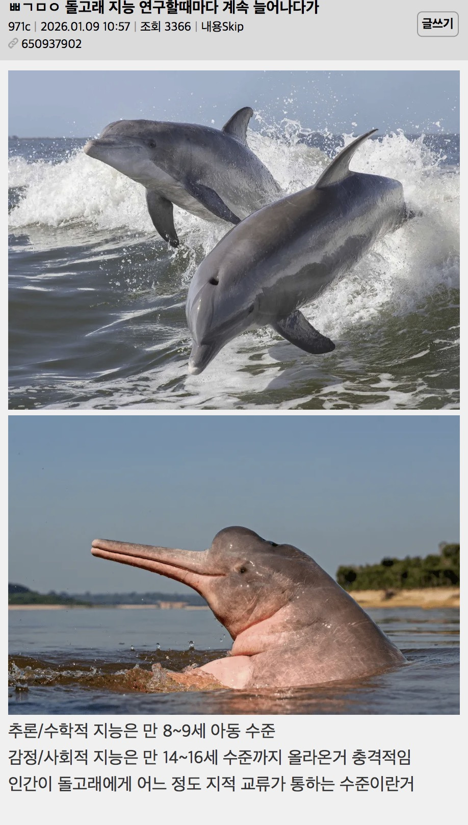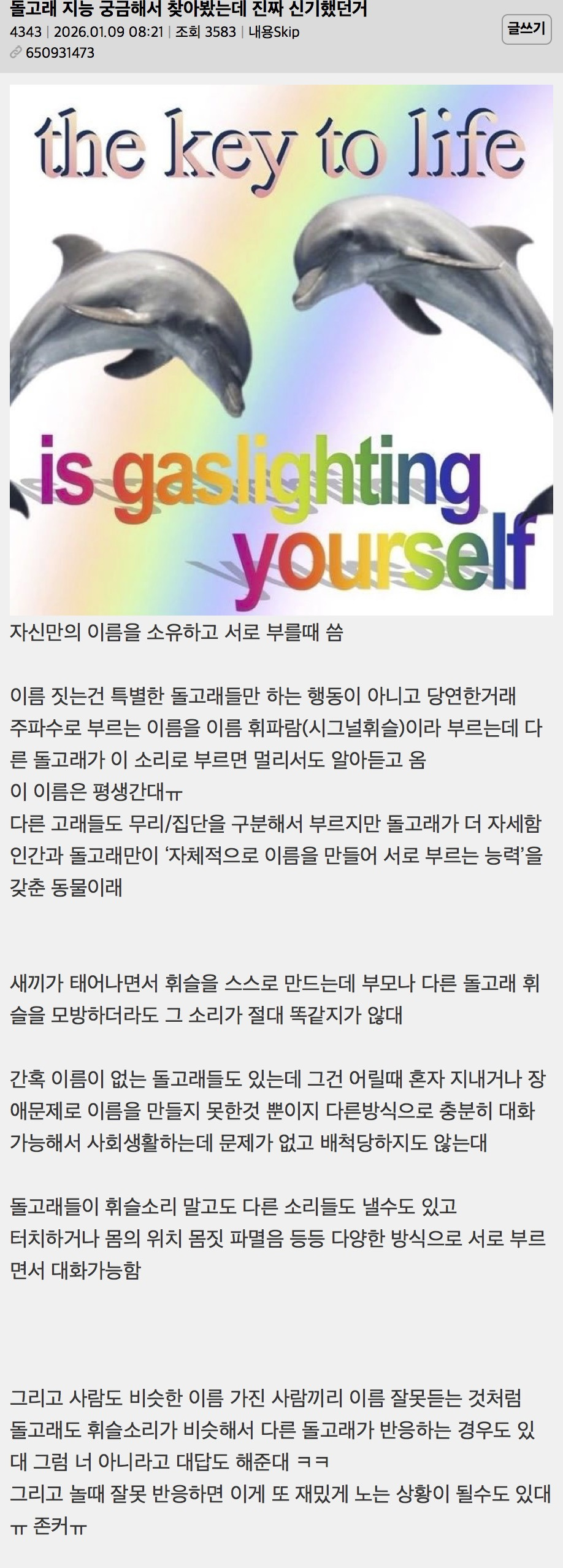 답댓글 작성자말미잘 작성시간 26.01.10 오 나도 이렇게 생각해본적 있음 돌고래들이 쉽게 하는거 인간은 못하는거 많잖아
