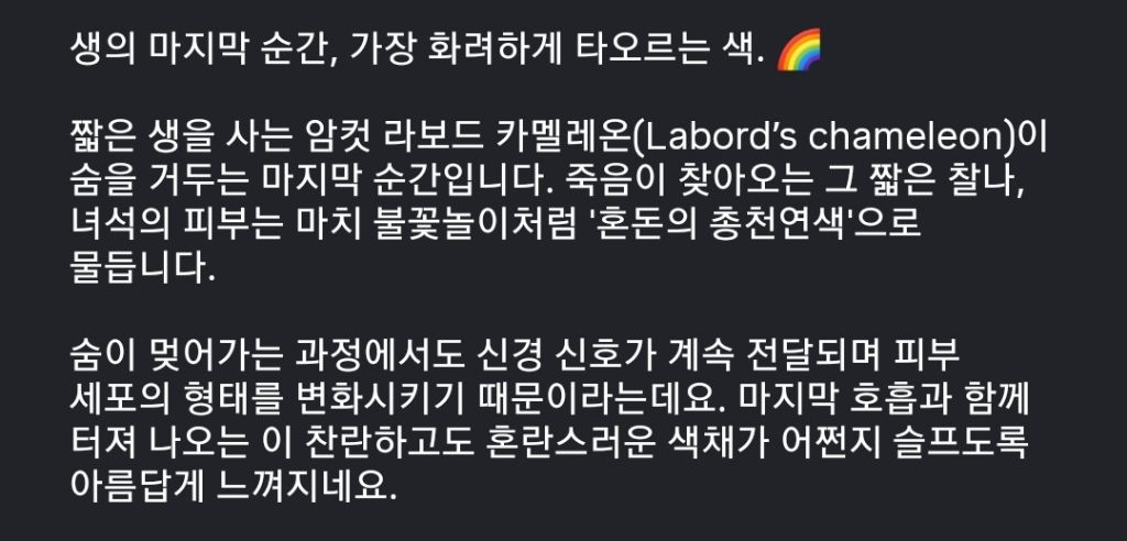 [스크랩] [흥미돋]죽기 직전 가장 화려해지는 카멜레온 작성자청토마|작성시간26.01.09|조회수26,442 목록 댓글 29 글자크기 작게가 글자크기 크게가 다음검색 스크랩 원문 : 이종격투기 현재 게시글 추가 기능 열기 북마크 공유하기 신고 센터로 신고 댓글 댓글 29 댓글쓰기 답글쓰기 댓글 리스트 작성자에라모르겠다ㅠ | 작성시간 26.01.10 왜죽는거야? ㅠㅠ 작성자별그지깽깽이같은곳에서 온 그대 | 작성시간 26.01.10 ㅠㅠ슬퍼... 작성자부디건강하게 | 작성시간 26.01.10 와 먼가 많은 생각이 드네.. 작성자선플달기위원회 | 작성시간 26.01.10 안아프게간거면 좋겟다 작성자두바이쫀득동현 | 작성시간 26.01.10 잘가.. 생각하면서 눈물닦고 댓글 보는데ㅜ 댓글보니까 더 슬퍼짐.. 댓글 전체보기