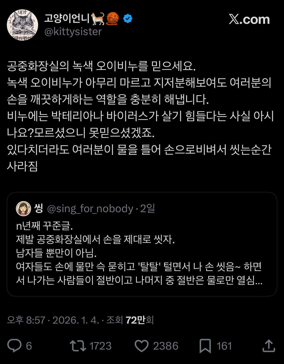 작성자쀼쮸쮸쀼 작성시간 26.01.10 나돜ㅋㅋ더러워보여도 걍 씻음. 근데 물로만 헹구고 손씻고왔다~하는 사람들보면 가까이하기 싫어짐(남자)