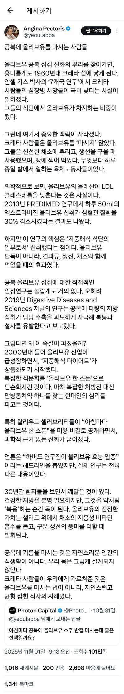 작성자십만불 작성시간 26.01.10 당연하지.... 올리브유의 효능이 아니라 전체적인 지중해식 식단의 효능이라고 봐야됨