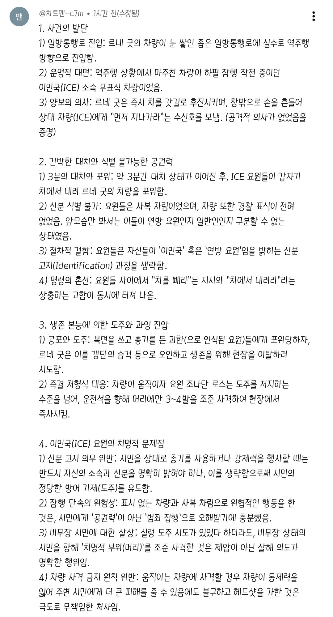 작성자정보접근을 작성시간 26.01.11 2찍들이 저거 옹호하잖아 ㅋㅋ 미국이 총기에 예민한 나라인데 공권력에 순순히 안따랐으니 죽을만했다고