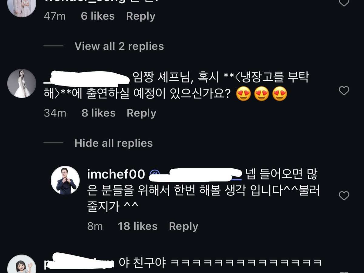 [흥미돋]슬슬 진행되고 있는거 같은 임짱 임성근 냉부 출연 작성자가나다라가나디|작성시간26.01.10|조회수51,340 목록 댓글 62 글자크기 작게가 글자크기 크게가 출처: https://theqoo.net/square/40571994961월 4일 댓글냉부에서 불러주시면^^ 어제 댓글좀만 기다리시면^^ 그가... 온다.... 다음검색 현재 게시글 추가 기능 열기 북마크 공유하기 신고 센터로 신고 댓글 댓글 62 댓글쓰기 답글쓰기 댓글 리스트 작성자와뚜와뚜와 | 작성시간 26.01.11 하 존나 쟘겠다 작성자인태희 | 작성시간 26.01.11 제발 김풍이랑 미러전 꼭 해주세요 작성자오늘밤 주인공은 나훈아 | 작성시간 26.01.12 민율이 닮은거 알겧네 ㅋㅋㅋㅋ 작성자웬만하면그들을막을수없다 | 작성시간 26.01.12 너무 기대돼.. 작성자솔트스플래쉬 | 작성시간 26.01.12 최 빼자 댓글 전체보기
