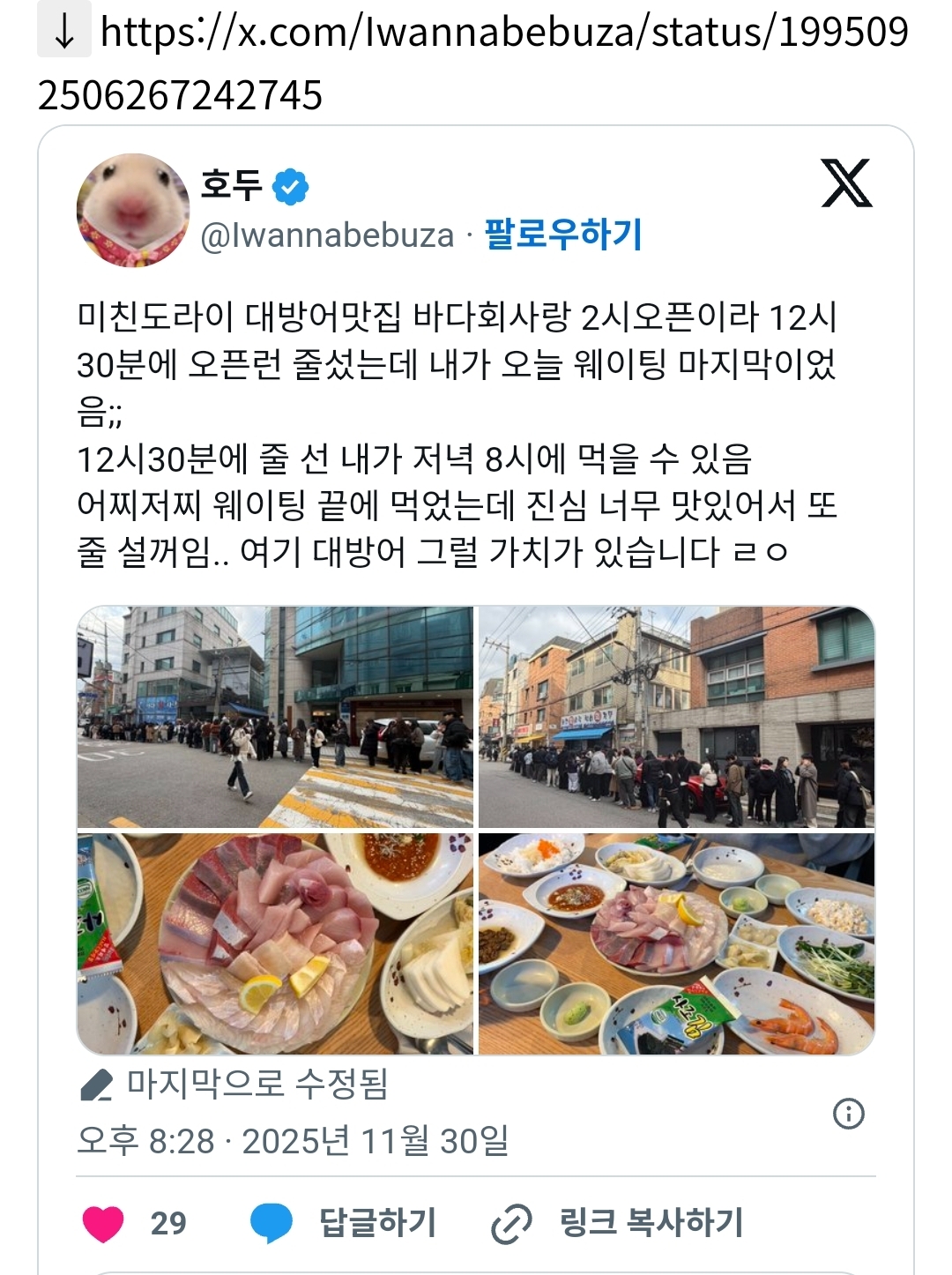 [흥미돋]현재 서울 방어 1티어라는 가게 작성자헤그리|작성시간26.01.10|조회수114,936 목록 댓글 132 글자크기 작게가 글자크기 크게가 출처: https://theqoo.net/square/4057138523주말엔 오픈런 웨이팅해도 못먹을 수 있음 주의 다음검색 현재 게시글 추가 기능 열기 북마크 공유하기 신고 센터로 신고 댓글 댓글 132 댓글쓰기 답글쓰기 댓글 리스트 작성자앎딹 | 작성시간 26.01.15 존나맛있긴해 .. 작성자다마메 | 작성시간 26.01.15 대체가 안돼.. 어차피 생선맛은 다 비슷할테니 다른데도 좀 저렇게 두껍게 썰어주면 좋겠는데 그런데가 없음 작성자세일러 코스모스 | 작성시간 26.01.17 저정돈 아니던데... 작성자57용마부활57 | 작성시간 26.01.18 그정도 아니라고!!!!!! 작성자브리트니점래 | 작성시간 26.01.18 별로야 흙맛나 진짜여 회사가 근처라 허구한날 회식으로 먹었름여기 먹을바에 노량진 전라수산가셈 댓글 전체보기