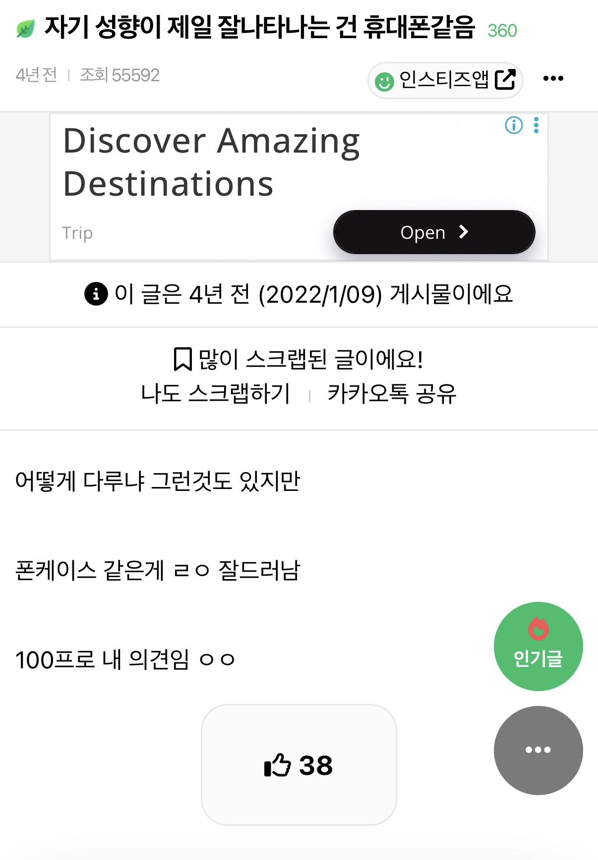 작성자레이철 작성시간 26.01.11 핸드폰 바꿀때 케이스 귀여운거 여러개 샀는데 지금 반년째 그 중 한개만 쓰고있단 사실을 깨달음 배경화면도 핸드폰 바꿀때 꾸며놓고 업데이트나 폰교체 하는거아니면 쭉감......