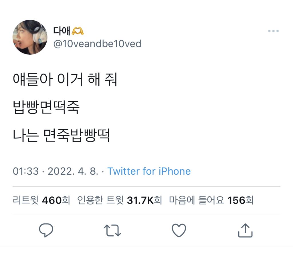 [스크랩] [흥미돋]얘들아 이거 해 줘 밥빵면떡죽 작성자#mood|작성시간26.01.11|조회수50,946 목록 댓글 572 글자크기 작게가 글자크기 크게가 다음검색 스크랩 원문 : 쭉빵카페 현재 게시글 추가 기능 열기 북마크 공유하기 신고 센터로 신고 댓글 댓글 572 댓글쓰기 답글쓰기 댓글 리스트 작성자조 윤 민 | 작성시간 26.01.12 밥빵면떡죽 작성자동물조아 | 작성시간 26.01.12 밥죽빵먄떡 작성자안뇽허삽나끼 | 작성시간 26.01.12 떡빵밥면죽 작성자샤갈맛도리 | 작성시간 26.01.18 면빵밥죽떡 작성자화려한죠르디 | 작성시간 26.01.18 면밥빵떡죽오 이렇게보니 나는 식감이아주중요한사람....쫄깃 쫀득이 좋고 진거 싫음 댓글 전체보기