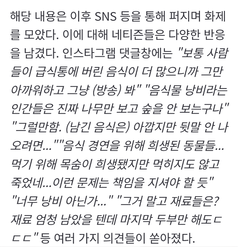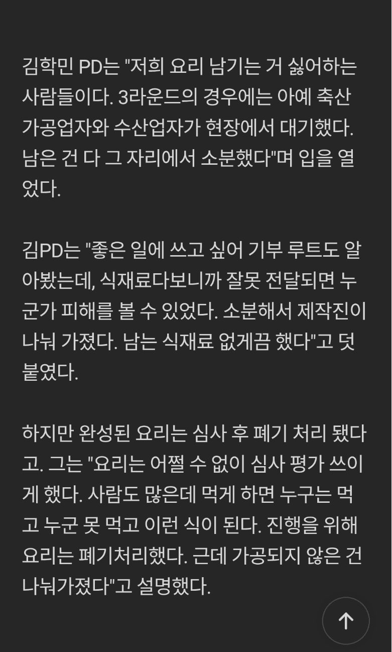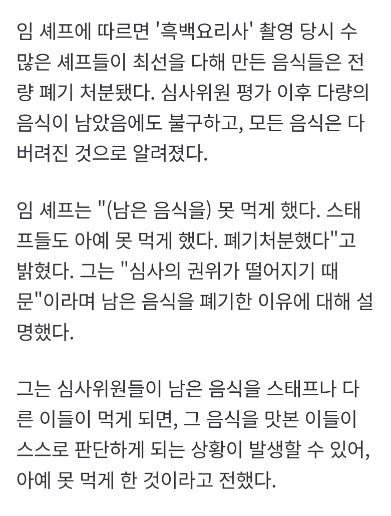 [흥미돋]흑백요리사 촬영 당시 남은 음식들은 다 어떻게 처리할까? 작성자보닌|작성시간26.01.11|조회수216,442 목록 댓글 250 글자크기 작게가 글자크기 크게가 출처: 여성시대 보닌흑백요리사1 철가방 요리사 인터뷰 中제작진도 못먹게 했다고 함 다음검색 현재 게시글 추가 기능 열기 북마크 공유하기 신고 센터로 신고 댓글 댓글 250 댓글쓰기 답글쓰기 댓글 리스트 작성자라라 크래프트 | 작성시간 26.01.14 제작진은 최선을 다한듯 작성자승승장구대성할여시 | 작성시간 26.01.14 본인이 먹으면 안되나?? 작성자맥그로우 | 작성시간 26.01.15 이해되네 작성자새벽봄비가 | 작성시간 26.01.16 이런거보면 먹는 컨텐츠가 지구에 유해하긴하구나 생각 들어 작성자응아참기힘들다 | 작성시간 26.01.16 잘했네뭐 댓글 전체보기
