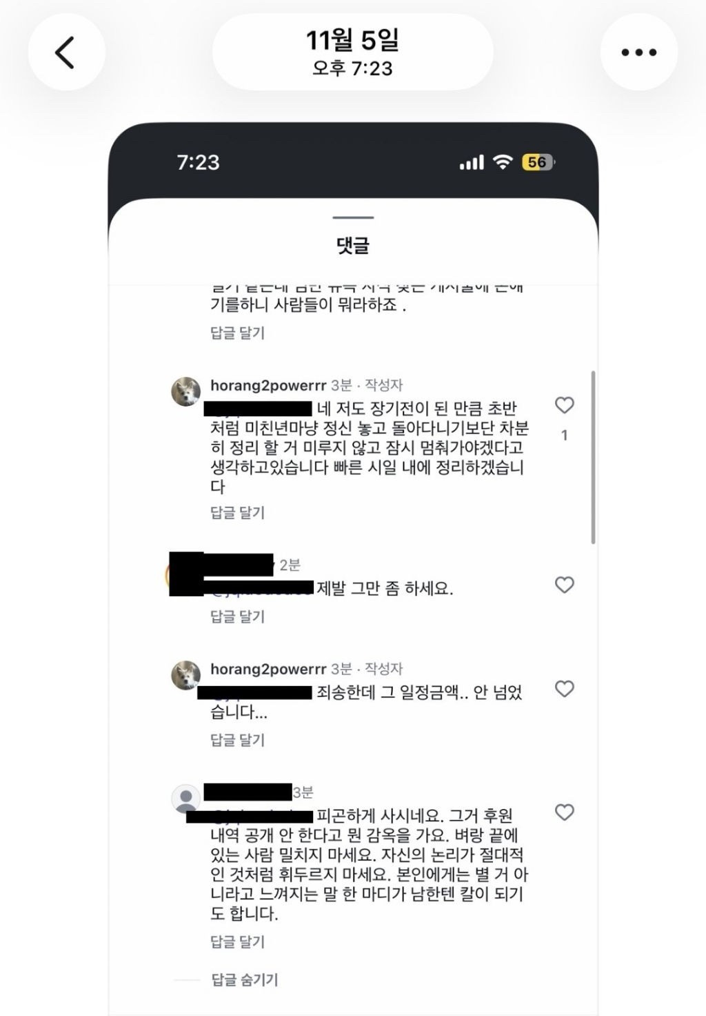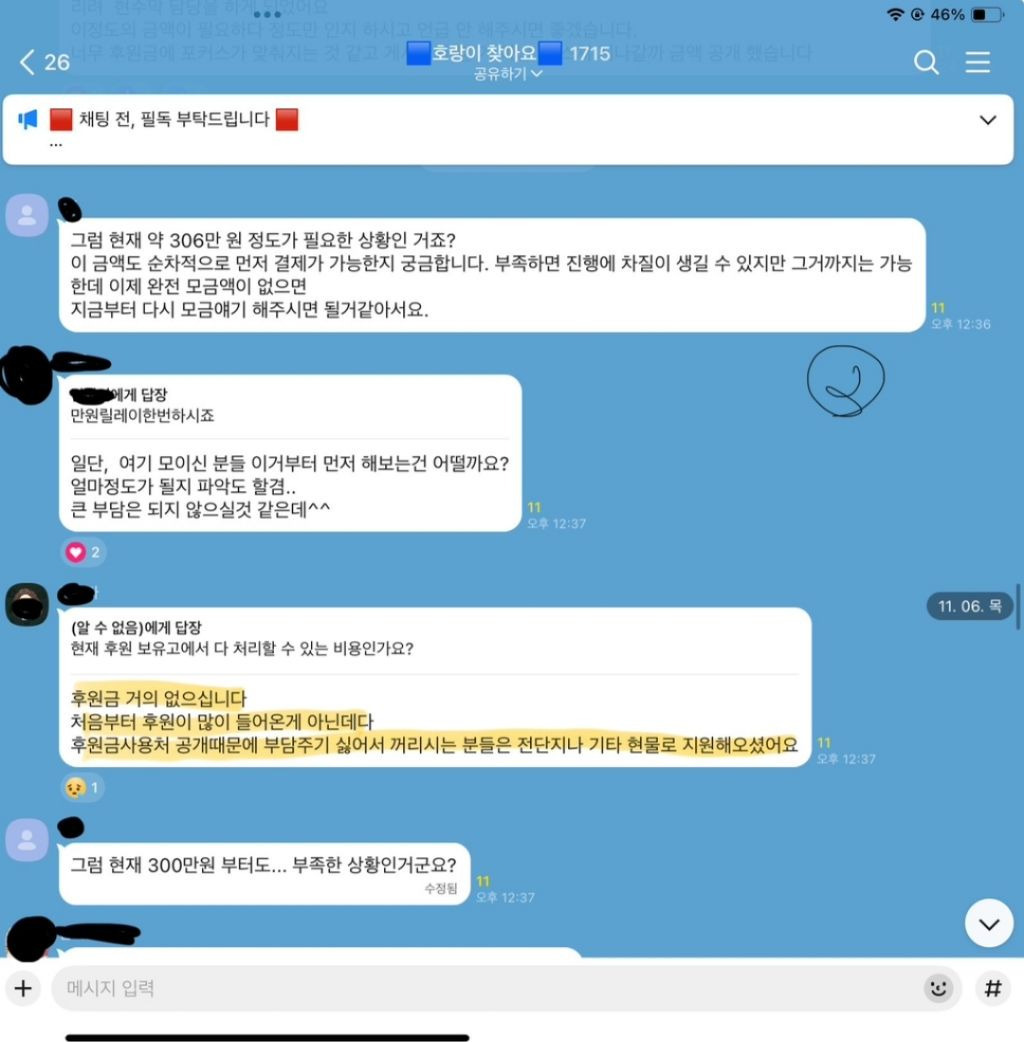 견주는 11월 5일경 후원금 관련 묻는 사람들에게