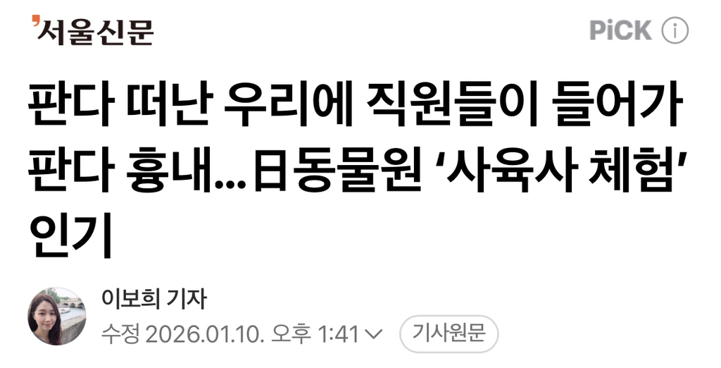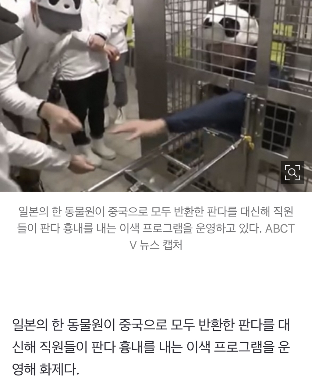 [여시뉴스데스크]판다 떠난 우리에 직원들이 들어가 판다 흉내…日동물원 ‘사육사 체험’ 인기 작성자소리앙|작성시간26.01.11|조회수8,788 목록 댓글 6 글자크기 작게가 글자크기 크게가 출처: https://naver.me/Gj7V2n4t판다 떠난 우리에 직원들이 들어가 판다 흉내…日동물원 ‘사육사 체험’ 인기일본의 한 동물원이 중국으로 모두 반환한 판다를 대신해 직원들이 판다 흉내를 내는 이색 프로그램을 운영해 화제다. 8일(현지시간) 홍콩 사우스차이나모닝포스트(SCMP)에 따르면 일본 와카야마n.news.naver.com전문출처 다음검색 현재 게시글 추가 기능 열기 북마크 공유하기 신고 센터로 신고 댓글 댓글 6 댓글쓰기 답글쓰기 댓글 리스트 작성자마 스퍼티지 | 작성시간 26.01.11 ㅁㅊ중국일줄 저게뭐여 작성자고다치즈 | 작성시간 26.01.11 중국이랑 외교 망해서 판다 없는거면서 참 속도 좋다 작성자악성민원감당은내가언제까지 | 작성시간 26.01.11 이상해.. 작성자뭔가부족하거든요 | 작성시간 26.01.11 별 그지같은걸 이색체험이라고 포장하네.. 작성자나나나나나나나나나나나나 | 작성시간 26.01.11 으아 좀...기괴한데;;; 댓글 전체보기