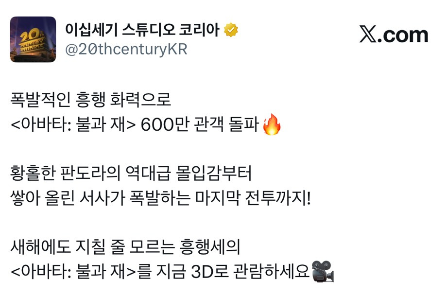 [흥미돋]아바타 불과재 600만 관객 돌파 작성자탱그르릉|작성시간26.01.11|조회수9,933 목록 댓글 20 글자크기 작게가 글자크기 크게가 출처: https://x.com/20thcenturykr/status/2010160058202767677?s=46&t=xu9s3SjGyuh3Zp63gjY4Pg 다음검색 현재 게시글 추가 기능 열기 북마크 공유하기 신고 센터로 신고 댓글 댓글 20 댓글쓰기 답글쓰기 댓글 리스트 작성자설키 | 작성시간 26.01.11 넘 잼씀 ㅠㅠㅠ 작성자폴라로이듀로브 | 작성시간 26.01.11 진짜개존잼 3차 찍음 작성자카피바라아아 | 작성시간 26.01.11 존나 잼써 작성자땀배달기 | 작성시간 26.01.11 빨리 다음주 상영 시간표 내놔 작성자초롱하츄핑 | 작성시간 26.01.12 오늘 보고 옴 2편보다 재미남 댓글 전체보기