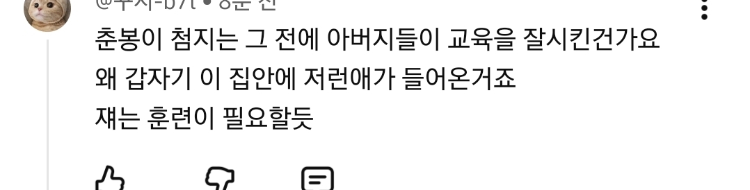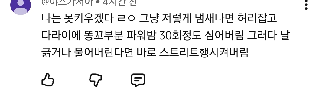 [칵.cxxx]언더월드 칠복이한테까지 악플다는 인간들 작성자우리강아지귀여워|작성시간26.01.11|조회수49,283 목록 댓글 437 글자크기 작게가 글자크기 크게가 출처: 여성시대 우리강아지귀여워 칠복이(9개월) 엉덩이에서 똥냄새난다고 씻기려고대야에 물받아놓음칠복이 패닉와서 소리지르고 도망갔다가 여차저차해서 씻김댓글에 칠복이는 보통 고양이라고 나시에 반바지입고씻기려는게 잘못아니냐가 대부분이지만 칠복이 악플도 있더라동물한테까지 악플다는 인간들은 싸패들이냐고 다음검색 현재 게시글 추가 기능 열기 북마크 공유하기 신고 센터로 신고 댓글 댓글 437 댓글쓰기 답글쓰기 댓글 리스트 작성자꿀꾸꿀 | 작성시간 26.01.31 한심하네 진짜ㅋㅋㅋ 작성자그래서 말인데 | 작성시간 26.01.31 아 지들이 미래에 당할 일 미리말하는 중이라고~~? 작성자그러를 그러세요 | 작성시간 26.01.31 고양이한테 악플다는 인생은 어떤인생일까? 작성자나는이제빛으로온전하리라 | 작성시간 26.01.31 정신병자들같음..왜 저래..? 작성자세상동물들행복해 | 작성시간 26.02.01 미친 새끼들 제정신이 아니네 ㅋㅋ 다 객사해라 댓글 전체보기