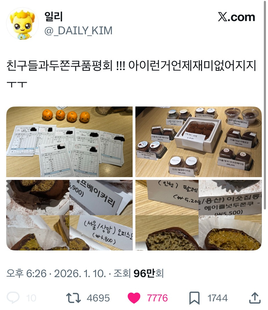 [흥미돋]친구들과 두쫀쿠 품평회‼️ 작성자열빙어|작성시간26.01.11|조회수66,273 목록 댓글 48 글자크기 작게가 글자크기 크게가 출처: https://x.com/_daily_kim/status/2009919705415643409?s=46&t=KlDqBlNqBJ3fwIZTZ3FsOg졸귀 ㅋㅋㅋㅋ후기는 본문 출처로 다음검색 현재 게시글 추가 기능 열기 북마크 공유하기 신고 센터로 신고 댓글 댓글 48 댓글쓰기 답글쓰기 댓글 리스트 작성자내치석치태다사라져라뿅 | 작성시간 26.01.11 ㅋㅋㅋㅋㅋ 아 재밌게들 노시네ㅋㅋ 작성자안산기슭곰발냄새타령부인사잘해 | 작성시간 26.01.12 팔레트 때깔미쳤다 작성자Oh my girl | 작성시간 26.01.14 귀엽닼ㅋㅋㅋㅋㅋ 작성자담밤 | 작성시간 26.01.15 팔레트 때깔미쳤다 나는 김민성셰프베이커리같은 비쥬얼만 먹어봐서 저런 촉촉두쫀쿠가 궁금ㅈ새 작성자인생되는대류 | 작성시간 26.01.15 맛잇겠다! 댓글 전체보기