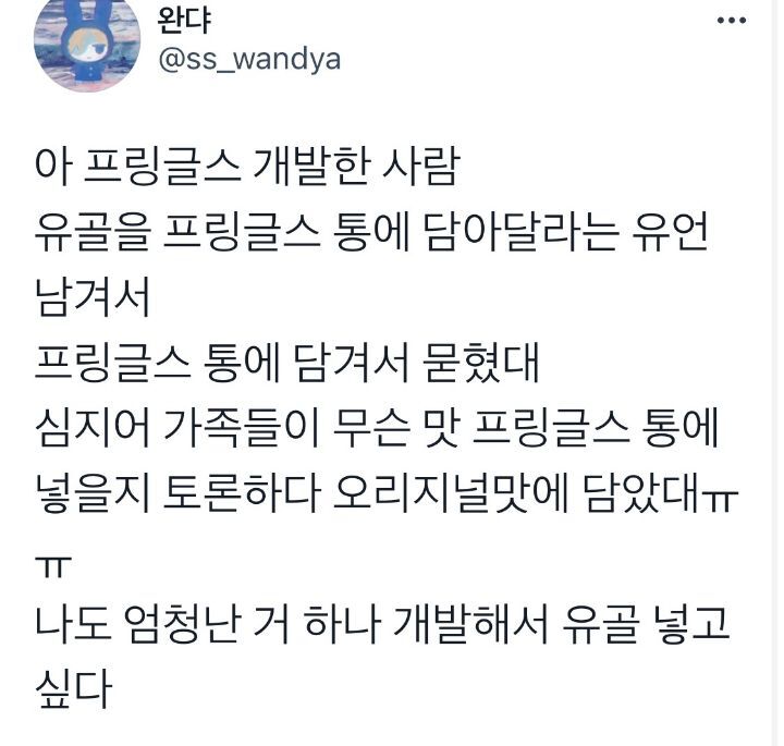 [스크랩] [흥미돋]프링글스 개발한 사람 죽기 전 유언이.jpg 작성자lucky girl|작성시간26.01.11|조회수83,852 목록 댓글 27 글자크기 작게가 글자크기 크게가 출처 : https://m.cafe.daum.net/SoulDresser/FLTB/482981?svc=daumapp&bucket=toros_cafe_channel_alpha 다음검색 스크랩 원문 : *여성시대* 차분한 20대들의 알흠다운 공간 현재 게시글 추가 기능 열기 북마크 공유하기 신고 센터로 신고 댓글 댓글 27 댓글쓰기 답글쓰기 댓글 리스트 답댓글 작성자너뉘기아 | 작성시간 26.01.12 ㅋㅋㅋㅋㅋㅋㅋㅋㅋㅋㅋㅋㅋ 작성자dive into you | 작성시간 26.01.11 오리지널 가루 ~~ 작성자트엄블르어 | 작성시간 26.01.11 핑크통 존맛인데.. 작성자이클립스그레이프 | 작성시간 26.01.11 미쳤다ㅋㅋㅋ개간지 작성자펫샵충들죽어 | 작성시간 26.01.11 무슨맛인지까지 정해주고가~! 댓글 전체보기