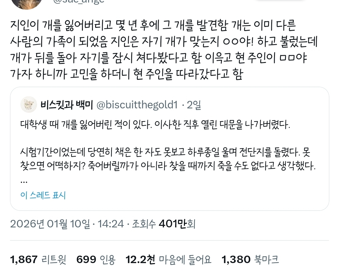 작성자카이지작성시간26.01.11조회수6,601 목록 댓글 14출처: https://twitter.com/biscuitthegold1/status/2009526838763339981?t=nltX0ZHEHzfvyfiBXNjY2A&s=19