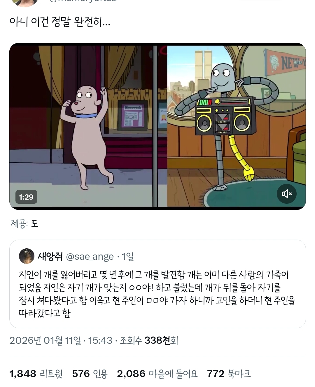 [기타]지인이 개를 잃어버리고 몇 년 후에 그 개를 발견하고 이름을 불렀다. 개는 잠시 쳐다보다가 (영화 로봇드림 스포 있음)