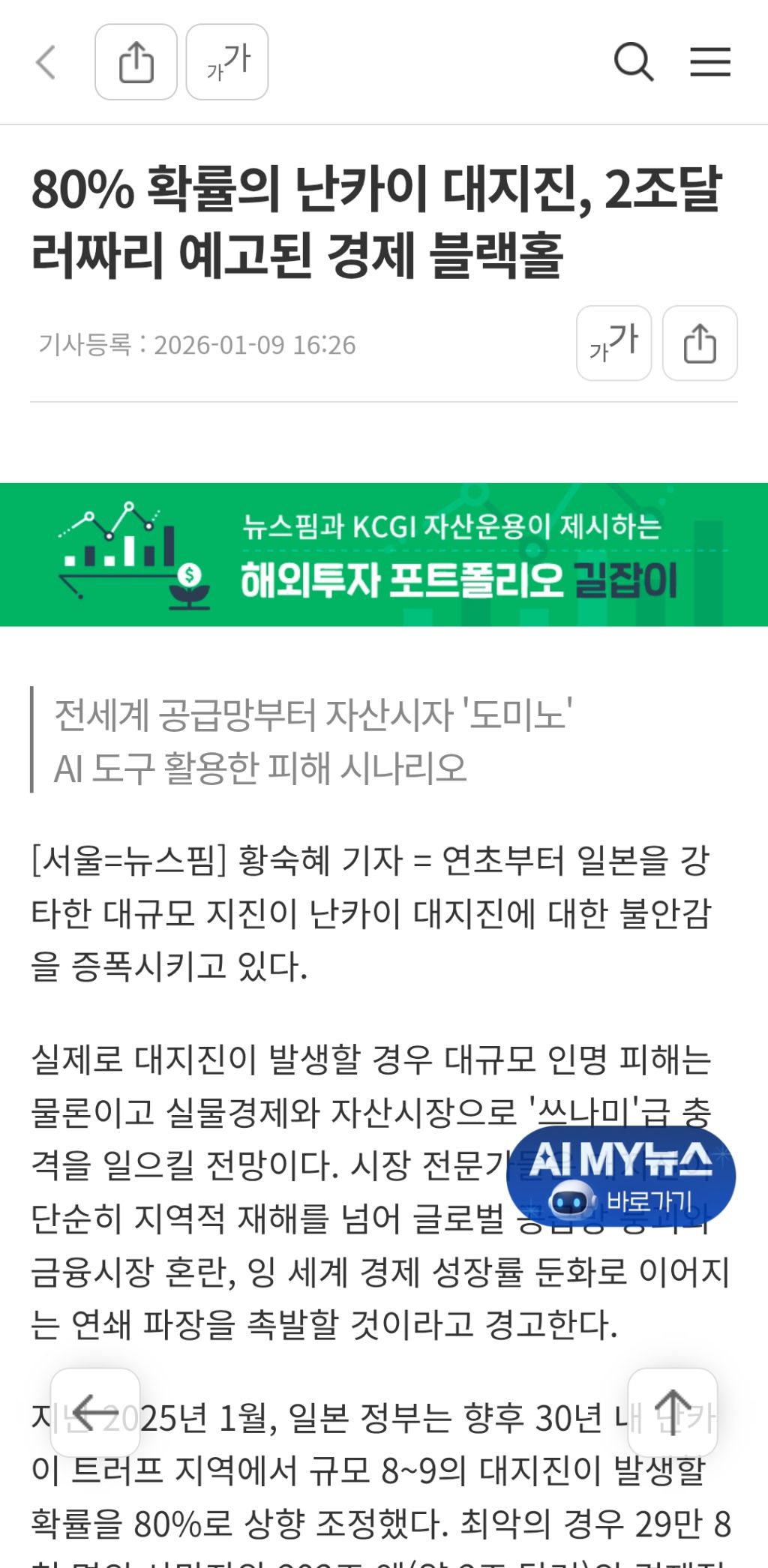 [여시뉴스데스크]80% 확률의 난카이 대지진, 2조달러짜리 예고된 경제 블랙홀 작성자정동남|작성시간26.01.11|조회수12,394 목록 댓글 22 글자크기 작게가 글자크기 크게가 출처: https://m.newspim.com/news/view/2026010900086680% 확률의 난카이 대지진, 2조달러짜리 예고된 경제 블랙홀[서울=뉴스핌] 황숙혜 기자 = 연초부터 일본을 강타한 대규모 지진이 난카이 대지진에 대한 불안감을 증폭시키고 있다. 실제로 대지진이 발생할 경우 대규모 인명 피해는 물론이고 실물경제와 m.newspim.com 다음검색 현재 게시글 추가 기능 열기 북마크 공유하기 신고 센터로 신고 댓글 댓글 22 댓글쓰기 답글쓰기 댓글 리스트 작성자2026하바바 | 작성시간 26.01.12 빨리와ㅠㅜ 작성자누리호4차 | 작성시간 26.01.12 아 구라핑 그만 하고 빨리 오시러고요 너무 기다리다 목빠지겟어요///// 작성자ICDIWABH | 작성시간 26.01.12 업보 청산 가즈아 ♡ 작성자박재범깔 | 작성시간 26.01.12 띠띠어 작성자쟤니제니쟨 | 작성시간 26.01.12 아직도 댓글 전체보기