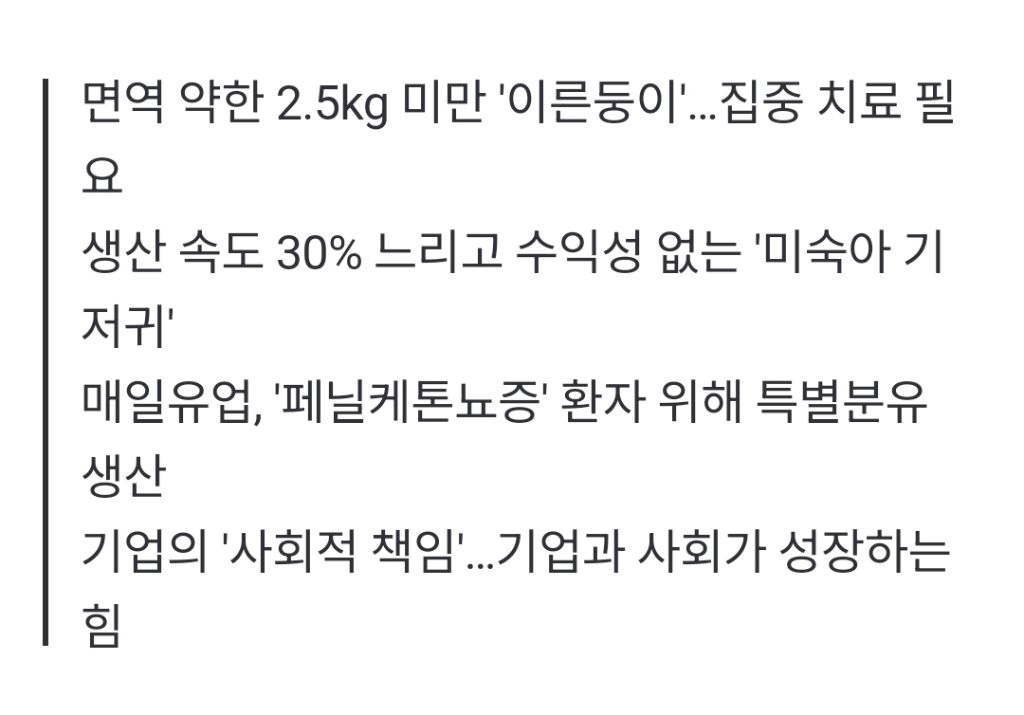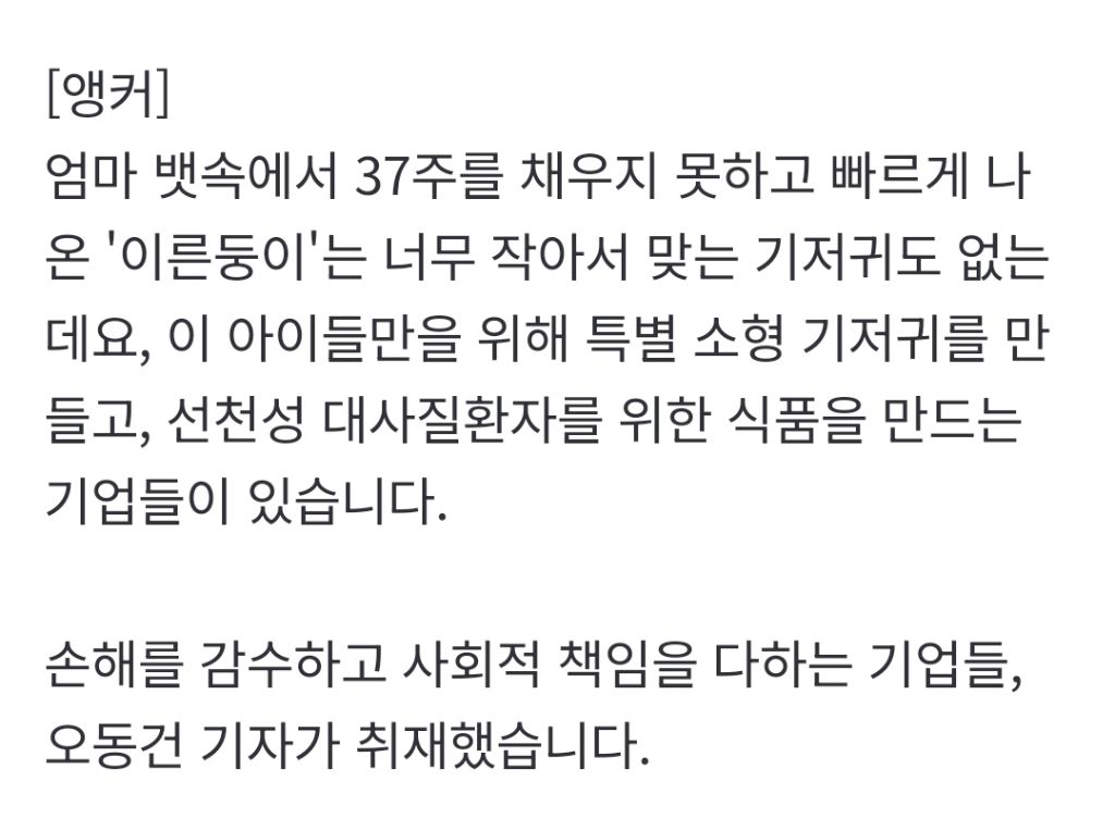 [스크랩] [기타]"손해 보면 어때"...소수 위한 기업의 '착한 생산' 작성자뚱쭝한 고양이|작성시간26.01.12|조회수13,409 목록 댓글 12 글자크기 작게가 글자크기 크게가 출처: https://naver.me/FzsAOkMN"손해 보면 어때"...소수 위한 기업의 '착한 생산'엄마 뱃속에서 37주를 채우지 못하고 빠르게 나온 '이른둥이'는 너무 작아서 맞는 기저귀도 없는데요, 이 아이들만을 위해 특별 소형 기저귀를 만들고, 선천성 대사질환자를 위한 식품을 만드는 n.news.naver.comhttps://youtu.be/k2LaPBT9bVs?si=XPjeCW6bSiyAcdjg전체 내용은 출처 혹은 영상으로 확인하기 다음검색 스크랩 원문 : *여성시대* 차분한 20대들의 알흠다운 공간 현재 게시글 추가 기능 열기 북마크 공유하기 신고 센터로 신고 댓글 댓글 12 댓글쓰기 답글쓰기 댓글 리스트 작성자muso | 작성시간 26.01.12 매일 너뿐이야 작성자테이크아웃커피 | 작성시간 26.01.12 역시 매일 작성자happyhappyhappy | 작성시간 26.01.12 남양도 뭐 만드는 건 처음 알았네... 다들 멋있다 작성자infp흘러가유 | 작성시간 26.01.12 ㅠ ㅠ 작성자헤비스모커 | 작성시간 26.01.12 진짜 매일... 어르신들 안부 우유 하는 것도 호감이라서일부러 사먹을 일 있을때 매일걸로 사먹어락토프리우유도 존맛 댓글 전체보기