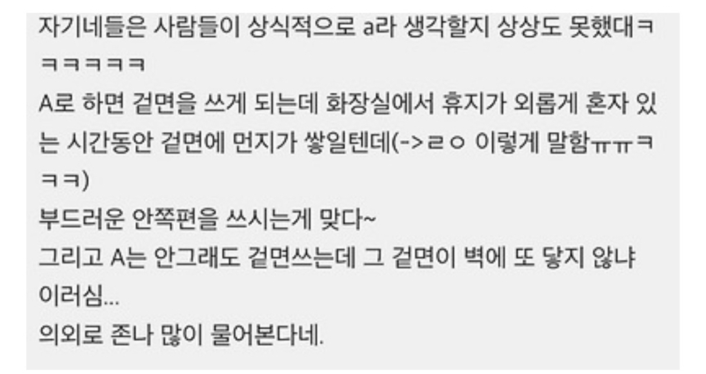 [흥미돋]휴지 거는 방향 궁금해서 크리넥스에 문의해봄 작성자알아서할게요?|작성시간26.01.12|조회수50,218 목록 댓글 80 글자크기 작게가 글자크기 크게가 출처: https://theqoo.net/square/4058206879 다음검색 현재 게시글 추가 기능 열기 북마크 공유하기 신고 센터로 신고 댓글 댓글 80 댓글쓰기 답글쓰기 댓글 리스트 작성자옥시페탈룸 | 작성시간 26.01.12 b..화장실벽에 결로있으면 a로 걸면 화장지 다젖음 작성자시저뷰뉴 | 작성시간 26.01.12 A는 벽에 휴지가 붙잖아 찝찝해 작성자나만악에서구하소서 | 작성시간 26.01.12 c 신경 안 씀 작성자everything needs love | 작성시간 26.01.12 나 이거 진짜 궁금했어; 작성자계단 오르락 내리락도 락이다 | 작성시간 26.01.12 아니 그럼 왜 겉에 문양을 찍냑오!! 겉에가 더 부드럽고 메인 같잔아 댓글 전체보기