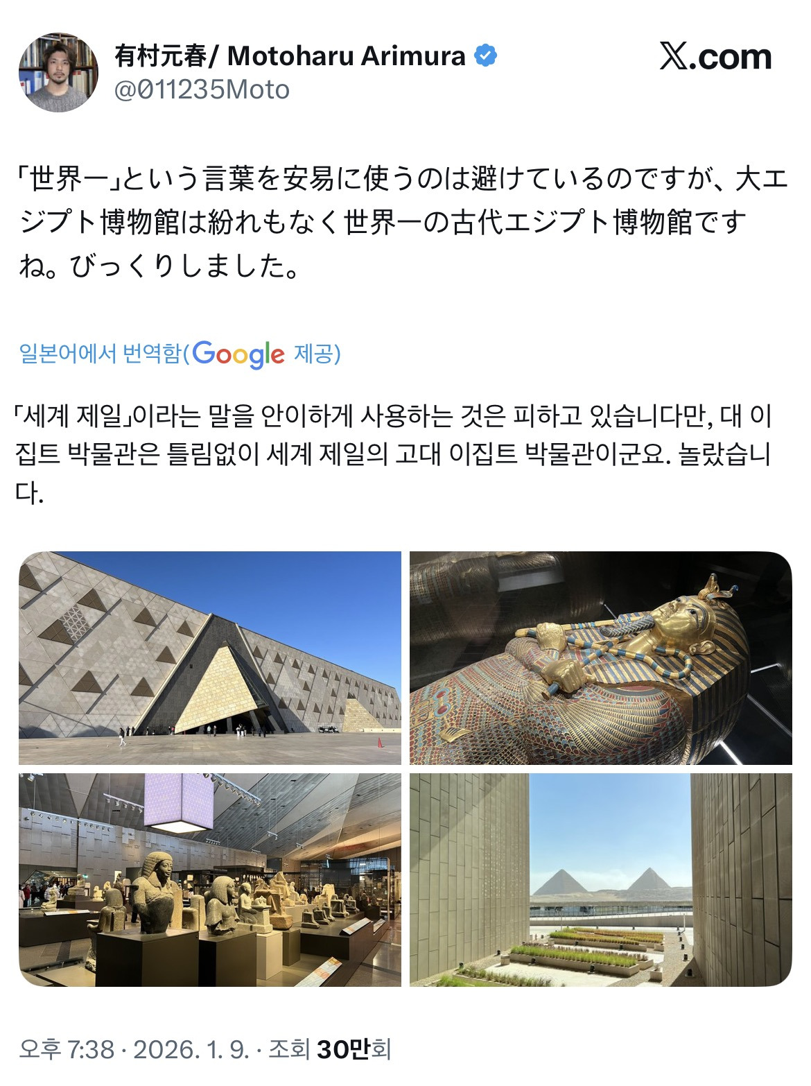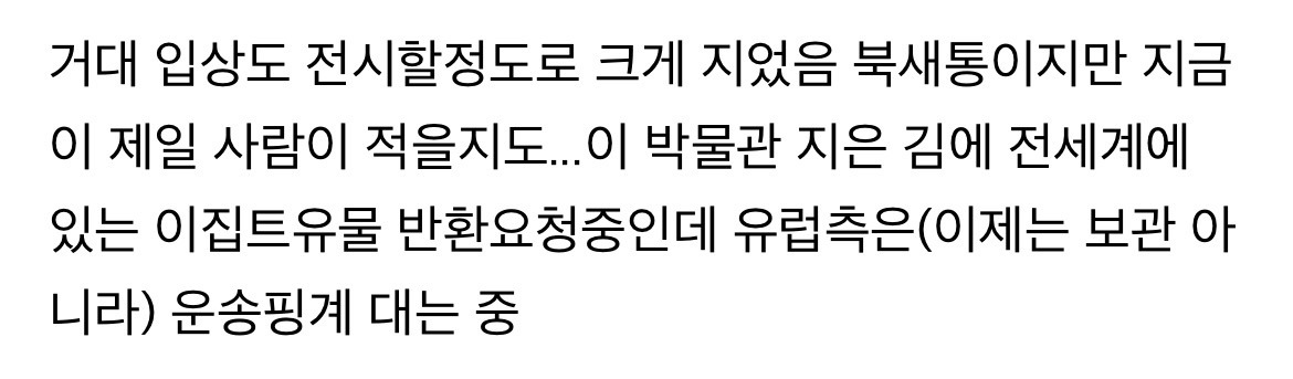 [흥미돋]이집트박물관 작성자어떡해벌써12시|작성시간26.01.12|조회수7,049 목록 댓글 13 글자크기 작게가 글자크기 크게가 출처: https://x.com/Mahmoud1Hashim/status/2009977820999758149?s=20https://theqoo.net/square/4058488833 다음검색 현재 게시글 추가 기능 열기 북마크 공유하기 신고 센터로 신고 댓글 댓글 13 댓글쓰기 답글쓰기 댓글 리스트 작성자몬지알g | 작성시간 26.01.12 담달에간다♥︎ 작성자울지마,지워줄게.우리가,싸워줄게. | 작성시간 26.01.12 유럽 도적놈들아 장물 내놔 작성자샛강역 | 작성시간 26.01.12 꼭갈거야 이집트... 작성자한국도로공사 하이패스 배구단 | 작성시간 26.01.12 유럽이 다 쌔비지했는데도 전시할게 잇구나 다행 작성자부찌머그러오세요 | 작성시간 26.01.12 작년에다냐옴 ㅋ GEM 너무 멋졌어.. 댓글 전체보기