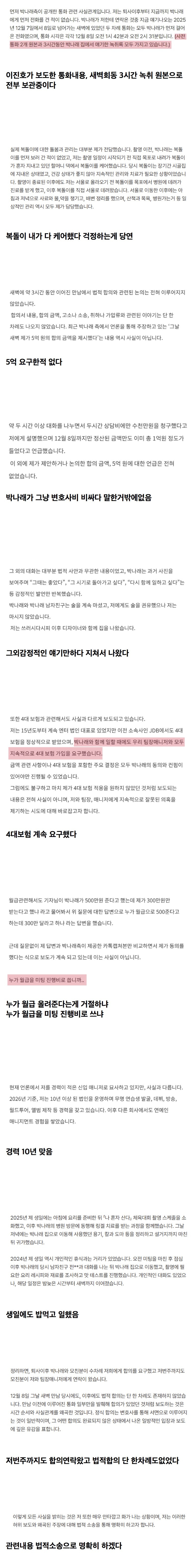 [기타]박나래 전매니저 새로운 입장문(이진호 반박) 작성자해피톡|작성시간26.01.12|조회수60,084 목록 댓글 51 글자크기 작게가 글자크기 크게가 출처: 여성시대 해피톡https://m.entertain.naver.com/home/article/241/0003488112https://m.entertain.naver.com/home/article/241/0003488124 다음검색 현재 게시글 추가 기능 열기 북마크 공유하기 신고 센터로 신고 댓글 댓글 51 댓글쓰기 답글쓰기 댓글 리스트 작성자따봉 혹등고래야 고마워 | 작성시간 26.01.12 걍 사이버렉카만 중간에서 유튜브 수익 번거지 뭐 작성자이타닉가든 | 작성시간 26.01.12 둘이 법원에서 싸워 걍 작성자뱃살소멸중 | 작성시간 26.01.12 이건 또 뭐야...이제 누구말을 믿어야할지 모르겠다 작성자무명이 | 작성시간 26.01.12 더 말 얹을것도 없이 증거랑 자료 있으면 법원 통해서 보상받으시길 작성자니가몰알아hh | 작성시간 26.01.12 법원에서 해결해라.. 언플 하지 말고 댓글 전체보기