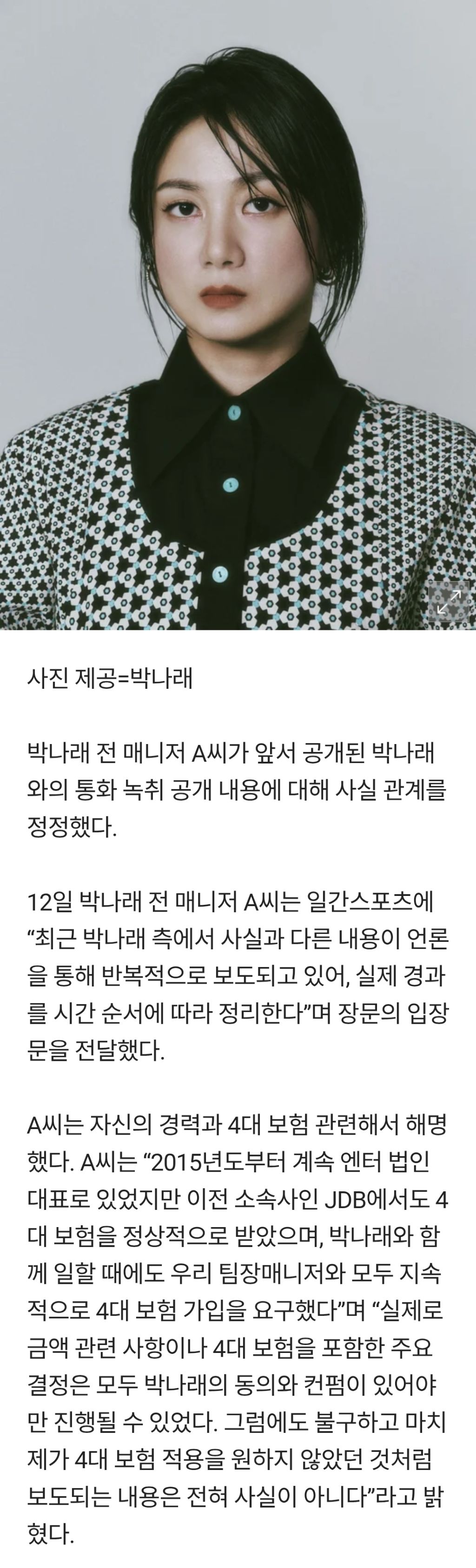 [여시뉴스데스크]박나래 前 매니저 반격…"난 10년 경력자, 누가 월급을 진행비로 쓰나" 작성자우주여시|작성시간26.01.12|조회수73,993 목록 댓글 31 글자크기 작게가 글자크기 크게가 출처: https://m.news.nate.com/view/20260112n16792 다음검색 현재 게시글 추가 기능 열기 북마크 공유하기 신고 센터로 신고 댓글 댓글 31 댓글쓰기 답글쓰기 댓글 리스트 작성자아구래욥 | 작성시간 26.01.12 알아서하세요 진짜 피로하다 작성자도태남 | 작성시간 26.01.12 박나래 파이팅 작성자걱정 | 작성시간 26.01.12 일이 이렇게까지 커질줄 몰랐다느니 왜이렇게된지 모르겟다하더니 본인이 자초한일이셔요.. 작성자식빵의 꿈 | 작성시간 26.01.12 매니저가 점점 더 이상해 보임 작성자진돗개=중형견 | 작성시간 26.01.13 박나래는 가만히 있고 저 매니저쪽만 계속 증거 푸는게 이상함.. 증거라고 풀었는데 말맞는것도 없고 댓글 전체보기