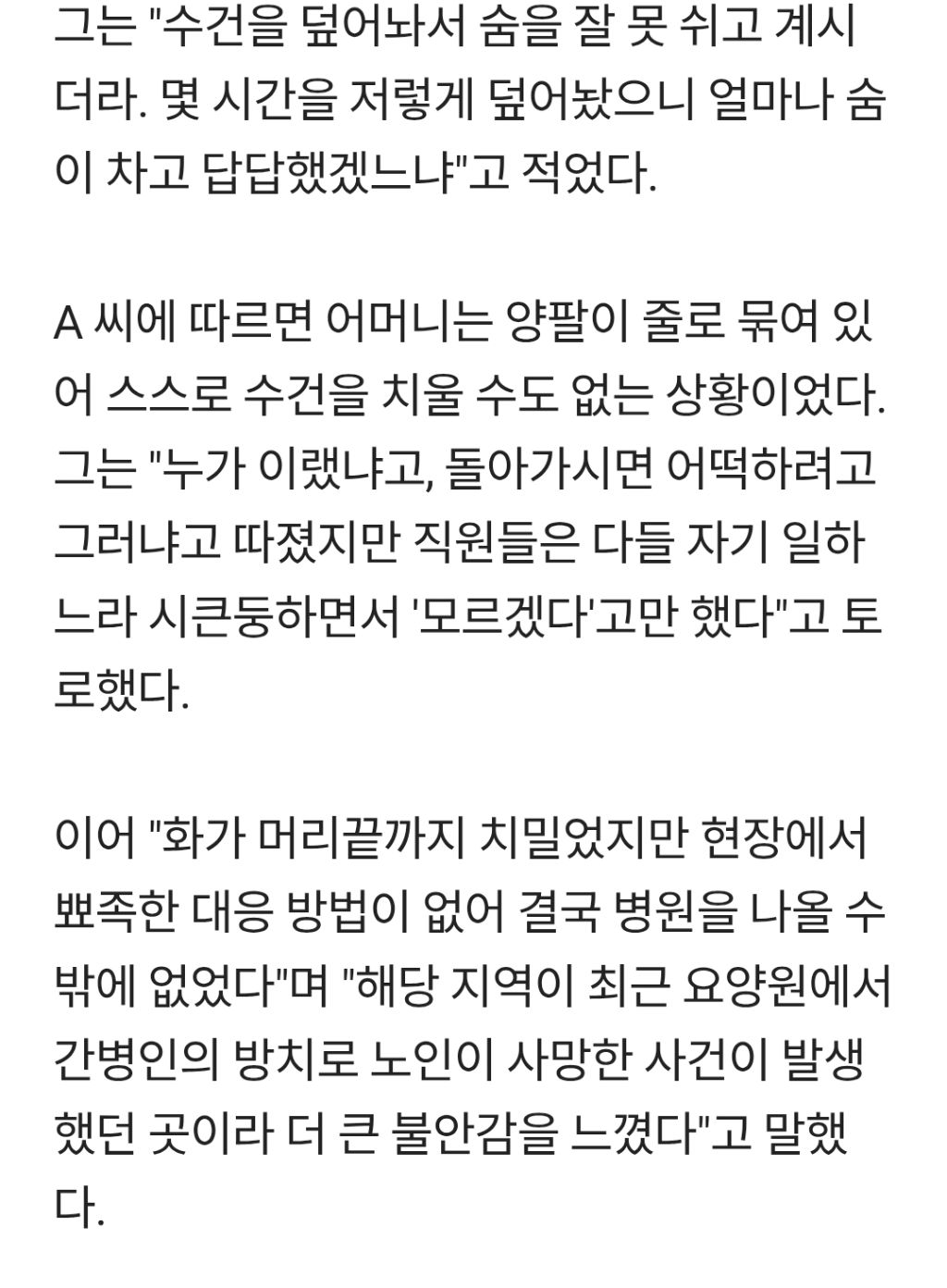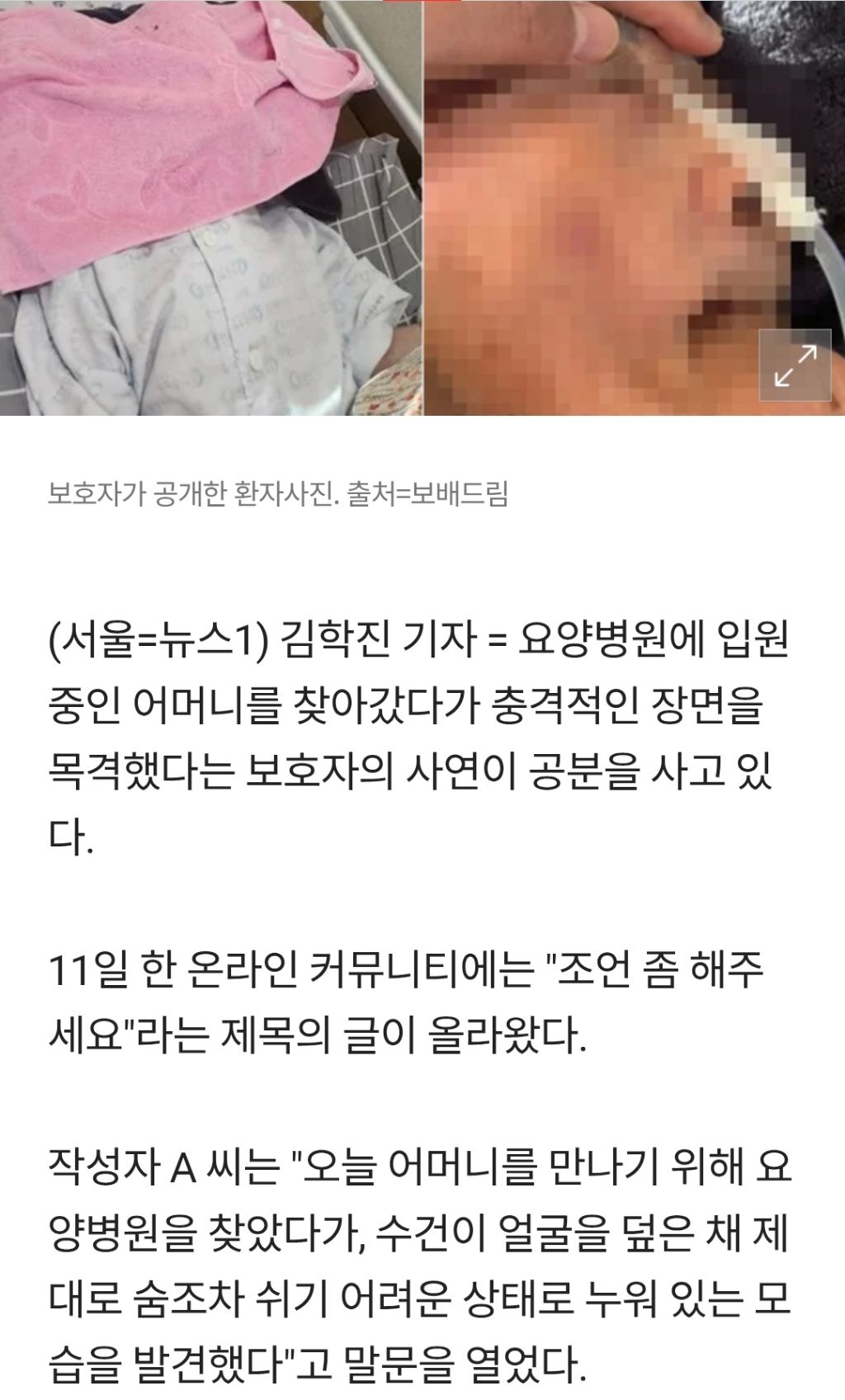 [여시뉴스데스크]노모 수건 덮어놔 숨 못 쉬게 한 요양병원, 항의하자 "내 절친이 시청 담당자" 작성자우주여시|작성시간26.01.12|조회수5,971 목록 댓글 25 글자크기 작게가 글자크기 크게가 출처: https://m.news.nate.com/view/20260112n16080 다음검색 현재 게시글 추가 기능 열기 북마크 공유하기 신고 센터로 신고 댓글 댓글 25 댓글쓰기 답글쓰기 댓글 리스트 작성자호머 심슨 | 작성시간 26.01.12 아니 지금 나도 양팔 줄로 묶고 얼굴에 수건 두면 공포스러울텐데 노인한테 미쳤나 작성자대통령이잼시 | 작성시간 26.01.12 아 진짜 시발 사람새끼들 맞냐..이러니까 편견생기지 ㅅㅂ 답댓글 작성자대통령이잼시 | 작성시간 26.01.12 공론화 더 안되나..우리 할배들도 다 요양원에 계시는데…아 너무 빡친다 작성자한남폐기물 | 작성시간 26.01.12 아 열받아 진짜 ㅡㅡ 작성자헤이댓츠미 | 작성시간 26.01.13 미친 댓글 전체보기