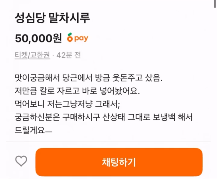 [흥미돋]맛이 궁금해서 사봤던 성심당 말차시루 팔아요.jpg 작성자pllo|작성시간26.01.12|조회수77,083 목록 댓글 50 글자크기 작게가 글자크기 크게가 출처: 여성시대 pllo 다음검색 현재 게시글 추가 기능 열기 북마크 공유하기 신고 센터로 신고 댓글 댓글 50 댓글쓰기 답글쓰기 댓글 리스트 작성자냥르장머리 | 작성시간 26.01.12 처먹은걸 팔고 지랄이야 작성자유월구일 | 작성시간 26.01.12 식품 싹다 신고해야해 두쫀쿠도 본인이 직접 만든거랑 가게에서 산거 되파는사람들있는데 싹다 신고함 작성자골목길에서도 방향지시등 켜띿오 | 작성시간 26.01.12 으 ㅋㅋㅋ... 작성자수 지 | 작성시간 26.01.12 지랄 작성자뫄뫄우우우 | 작성시간 26.01.12 우리동네 당근도 두쫀쿠 두 배 가격으로 올라오는 글 짱많어ㅡㅡ 댓글 전체보기
