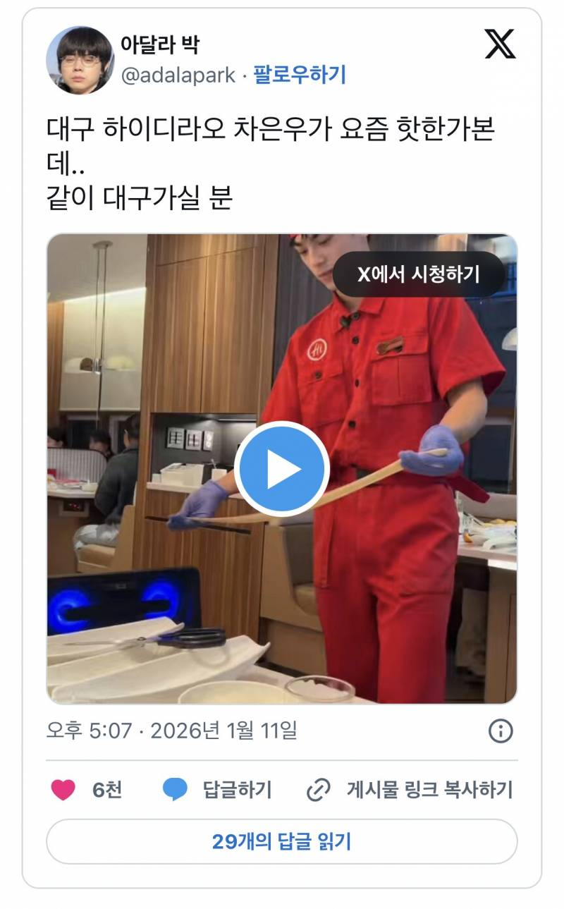 [흥미돋]SNS에서 차은우 닮았다고 화제인 대구 하이디라오 직원 작성자MEOVV|작성시간26.01.12|조회수49,095 목록 댓글 181 글자크기 작게가 글자크기 크게가 출처: https://theqoo.net/square/4058997575더쿠 - SNS에서 차은우 닮았다고 화제인 대구 하이디라오 직원https://youtube.com/shorts/Pl1mlxO7HTU?si=K0wh1_2WAcvKpUzItheqoo.net ↓https://youtube.com/shorts/Pl1mlxO7HTU?si=K0wh1_2WAcvKpUzI 다음검색 현재 게시글 추가 기능 열기 북마크 공유하기 신고 센터로 신고 댓글 댓글 181 댓글쓰기 답글쓰기 댓글 리스트 작성자하좃뺑이타임시작 | 작성시간 26.01.13 착즙 ㅅ ㅂ 작성자맵싀짱 | 작성시간 26.01.13 와 진짜 노잼봇닮았네 작성자플로리다 | 작성시간 26.01.13 엥 노잼봇 아님? 작성자머랏 | 작성시간 26.01.14 몇주전엔 부산에있던데 옮겨갔네.. 면 저거 잘 못한다고 하면서 시작하더니 진짜 잘 못하더라 ㅋㅋㅋ릴스에 면은우라고 ㅈㄴ뜸 ㅠ그만떠 작성자냥하리 | 작성시간 26.01.14 노잼봇아님? 댓글 전체보기