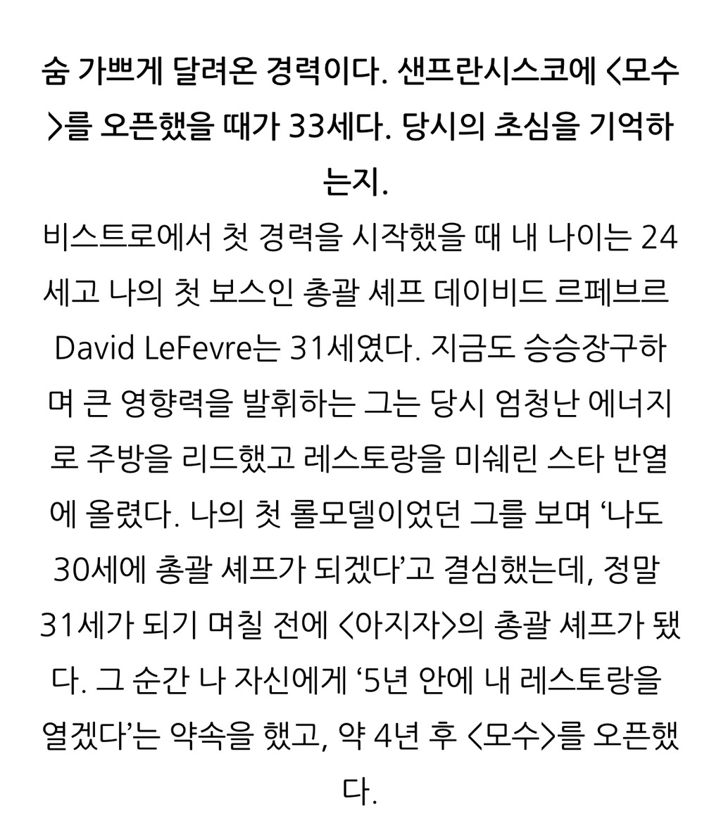 33세에 당시 가장 핫햇던 샌프란시스코에 자신의 레스토랑 ‘모수’ 를 오픈.
