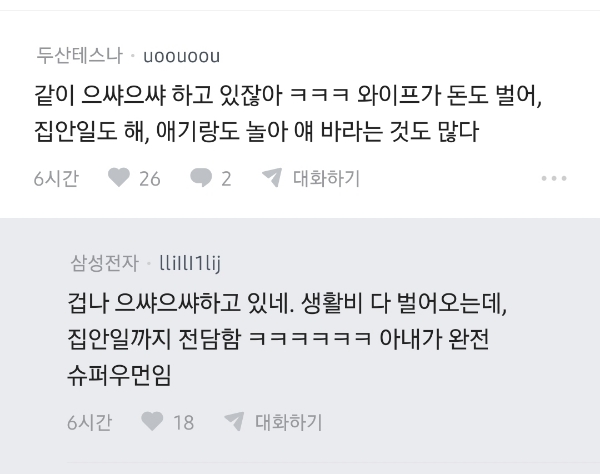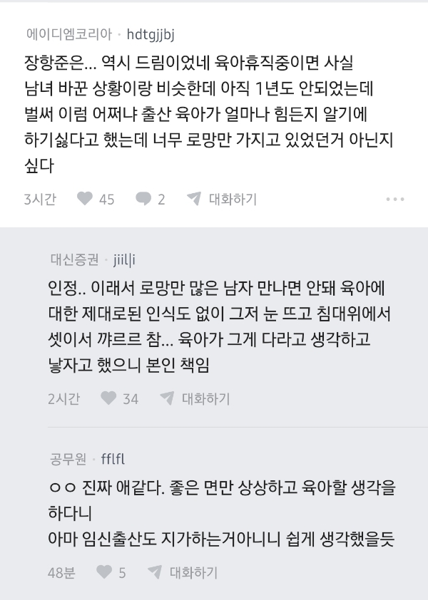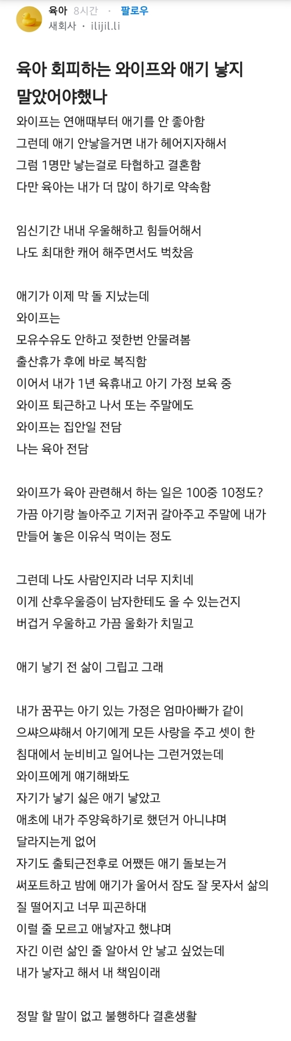 [흥미돋]육아 회피하는 와이프와 애기 낳지 말았어야했나 작성자야호우|작성시간26.01.12|조회수48,986 목록 댓글 301 글자크기 작게가 글자크기 크게가 출처: 여성시대 (야호우) https://www.teamblind.com/kr/s/1awmwg5b 다음검색 현재 게시글 추가 기능 열기 북마크 공유하기 신고 센터로 신고 댓글 댓글 301 댓글쓰기 답글쓰기 댓글 리스트 작성자밀키스제로존맛 | 작성시간 26.01.14 참나 ㅋㅋㅋㅋㅋ 작성자탬버린해피버스 | 작성시간 26.01.14 입장 바꿔서 올렸음 출휴중이니 버티라고 했을걸 ㅋㅋ 작성자닉네임을수정해주셰요. | 작성시간 26.01.14 이런여자 천만명 아님? ㅋㅋㅋ 진짜 뭣도모르고.. 에휴 작성자뭘해도 2찍보다 1찍 이재명지지 | 작성시간 26.01.14 육아휴직인데 집안일은 왜안해? 작성자긁는복권당첨 | 작성시간 26.01.26 진자 어쩌라고다 시발 댓글 전체보기