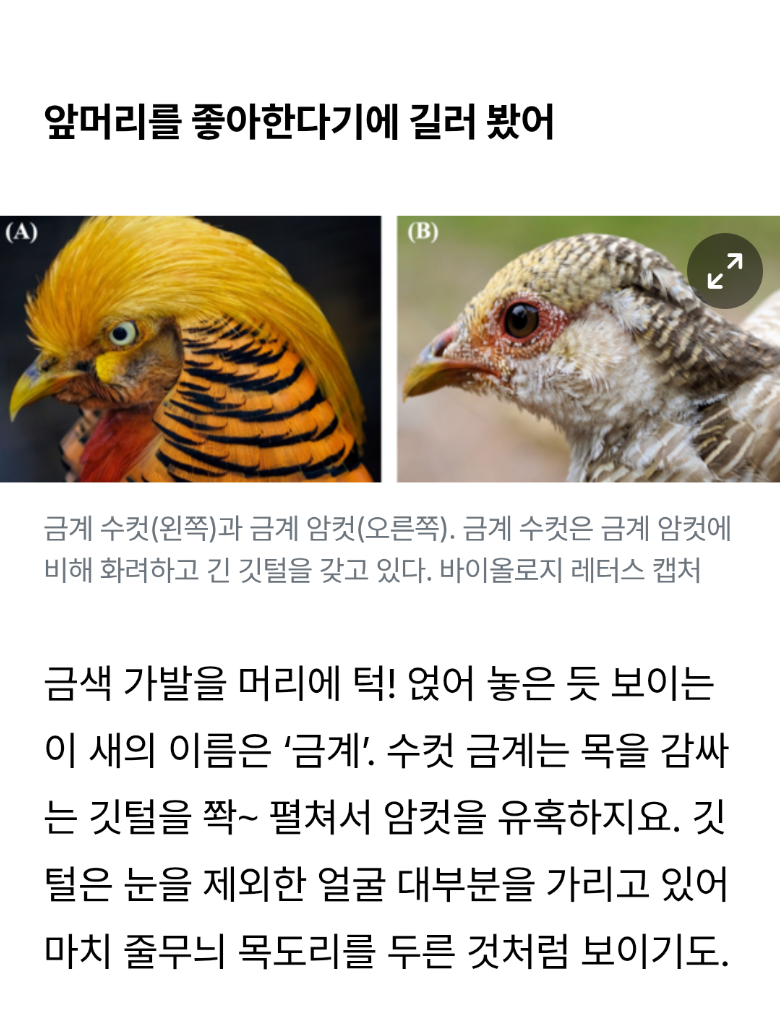 [흥미돋]금계 수컷, 암컷에게 구애 받기위해 앞머리 기른다 작성자보닌|작성시간26.01.12|조회수25,024 목록 댓글 14 글자크기 작게가 글자크기 크게가 출처: 여성시대 보닌화려하면 눈에 띄어서 생명에 위험있는데도 암컷한테 선택받기위해 기르는거임 다음검색 현재 게시글 추가 기능 열기 북마크 공유하기 신고 센터로 신고 댓글 댓글 14 댓글쓰기 답글쓰기 댓글 리스트 작성자나랑 변보러 가지 않을래 | 작성시간 26.01.12 파마는 안해? 작성자새라핌 | 작성시간 26.01.12 금태양이잖아 작성자코코밤쇼킹 | 작성시간 26.01.12 왜 남성별들은 사랑에 빠지면 머리를 건들까. 인간은 파마하고 금계는 앞머리를 기르네 작성자Mooineno | 작성시간 26.01.12 자기가 뒤로 넘긴건가? 엄청 정갈하잖어 작성자내심장은오직Lee | 작성시간 26.01.12 구애 받기 위해 꾸몄는데 람뿌새라는 소리나 듣고.... 비통하겠다ㅠ 댓글 전체보기