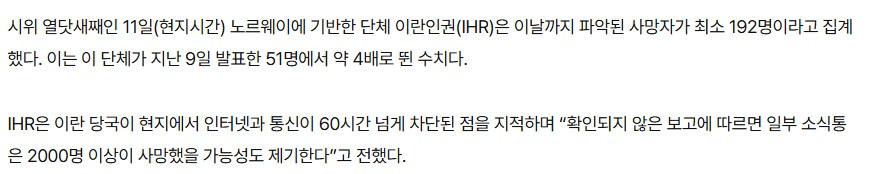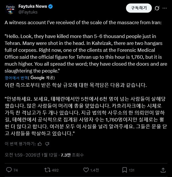 [스크랩] [기타]학살이 일어난 이란 작성자청토마|작성시간26.01.12|조회수21,164 목록 댓글 64 글자크기 작게가 글자크기 크게가 링크 혐오 주의 https://x.com/michaelh992/status/2010386722136432723 Xx.com 다음검색 스크랩 원문 : 도탁스 (DOTAX) 현재 게시글 추가 기능 열기 북마크 공유하기 신고 센터로 신고 댓글 댓글 64 댓글쓰기 답글쓰기 댓글 리스트 작성자토마토주스먹고싶다 | 작성시간 26.01.13 미친거아냐...? 작성자사람이성공하려면비혼비출산해야 | 작성시간 26.01.13 광주 생각나고 계엄 생각나ㅜㅜ 다들 무사하셨으면…. 작성자우울해하지말자? | 작성시간 26.01.13 미친것들아 ㅠㅠㅠ 작성자이킁에킁 | 작성시간 26.01.13 미쳤다... 작성자홍차코코아 | 작성시간 26.01.13 학살하면 뭐해 먹을게없는데 어차피 못살아 시위하다죽나 굶어죽나한국인 밥한공기 천원에서 5만원됐다고생각해봐 버티겠냐고 댓글 전체보기