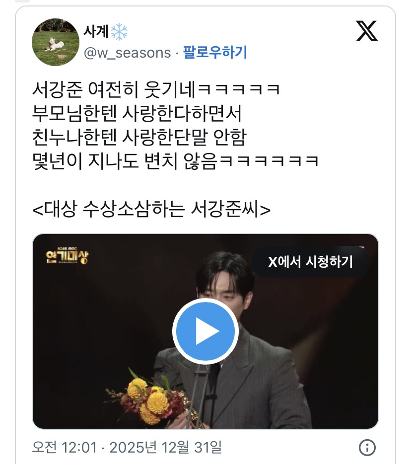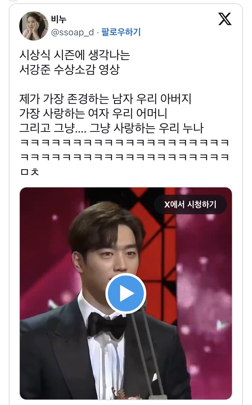 [스크랩] [흥미돋]변함없는 서강준 수상소감이 개웃김 ㅋㅋㅋㅋㅋㅋㅋㅋㅋ..twt 작성자출근쬬|작성시간26.01.12|조회수9,823 목록 댓글 10 글자크기 작게가 글자크기 크게가 출처: https://theqoo.net/square/4046118708더쿠 - 변함없는 서강준 수상소감이 너무 웃김 ㅋㅋㅋㅋㅋㅋㅋㅋㅋㅋㅋㅋㅋㅋㅋㅋㅋㅋㅋㅋㅋ..t여기를 눌러 링크를 확인하세요theqoo.nethttps://x.com/i/status/1740722569383477410그냥... 그냥 사랑하는 우리 누나...https://x.com/i/status/2006017854789890318우리 누나... 잘... 살아라! 다음검색 스크랩 원문 : *여성시대* 차분한 20대들의 알흠다운 공간 현재 게시글 추가 기능 열기 북마크 공유하기 신고 센터로 신고 댓글 댓글 10 댓글쓰기 답글쓰기 댓글 리스트 작성자남이사 전봇대로 이빨을 쑤시던..^^ | 작성시간 26.01.12 자알..살아라..! 작성자괌돨이푸 | 작성시간 26.01.12 원글댓보다알았는데 누나 직업이랑 전공도 잘못알고있었단거도 개웃기다ㅋㅋㅋㄲ 작성자두바이쫀득찹쌀떡 | 작성시간 26.01.12 ㅋㅋㅋㅋㅋㅋ 작성자파프리차 | 작성시간 26.01.12 그래도 저렇게 언급하는 거 자체가 애정이 있어야 가능한 ㅋㅌㅌ 작성자백살까지사세요 | 작성시간 26.01.12 서강준 대상? 뭐했는지 찾아봐야지 댓글 전체보기