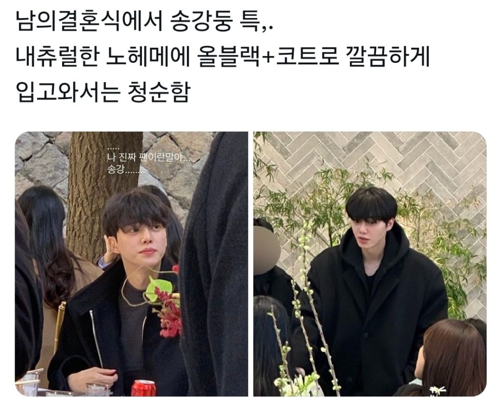 [흥미돋]매니저 결혼식 간 송강 작성자비나이다룽|작성시간26.01.12|조회수141,683 목록 댓글 253 글자크기 작게가 글자크기 크게가 출처: https://theqoo.net/square/4059367888더쿠 - 본인 매니저의 결혼식에 참석한 송강.jpg여기를 눌러 링크를 확인하세요theqoo.net 다음검색 현재 게시글 추가 기능 열기 북마크 공유하기 신고 센터로 신고 댓글 댓글 253 댓글쓰기 답글쓰기 댓글 리스트 작성자말차녹차 | 작성시간 26.01.19 와 신기하게생김 작성자해냈다 여시 | 작성시간 26.01.19 비율 뭐야 실화냐 작성자핵건 | 작성시간 26.01.21 청초하다 비율 사기 작성자루비비키 | 작성시간 26.01.21 애초에 사진 자체가 왜곡이 좀 있는 거 같은데 그거 감안해도 혼자 비율 진짜 좋다… 작성자느개비 대가리 할리갈리종 | 작성시간 26.01.25 머리뭐야 미쳤어? 없어지는거 아냐???? 댓글 전체보기