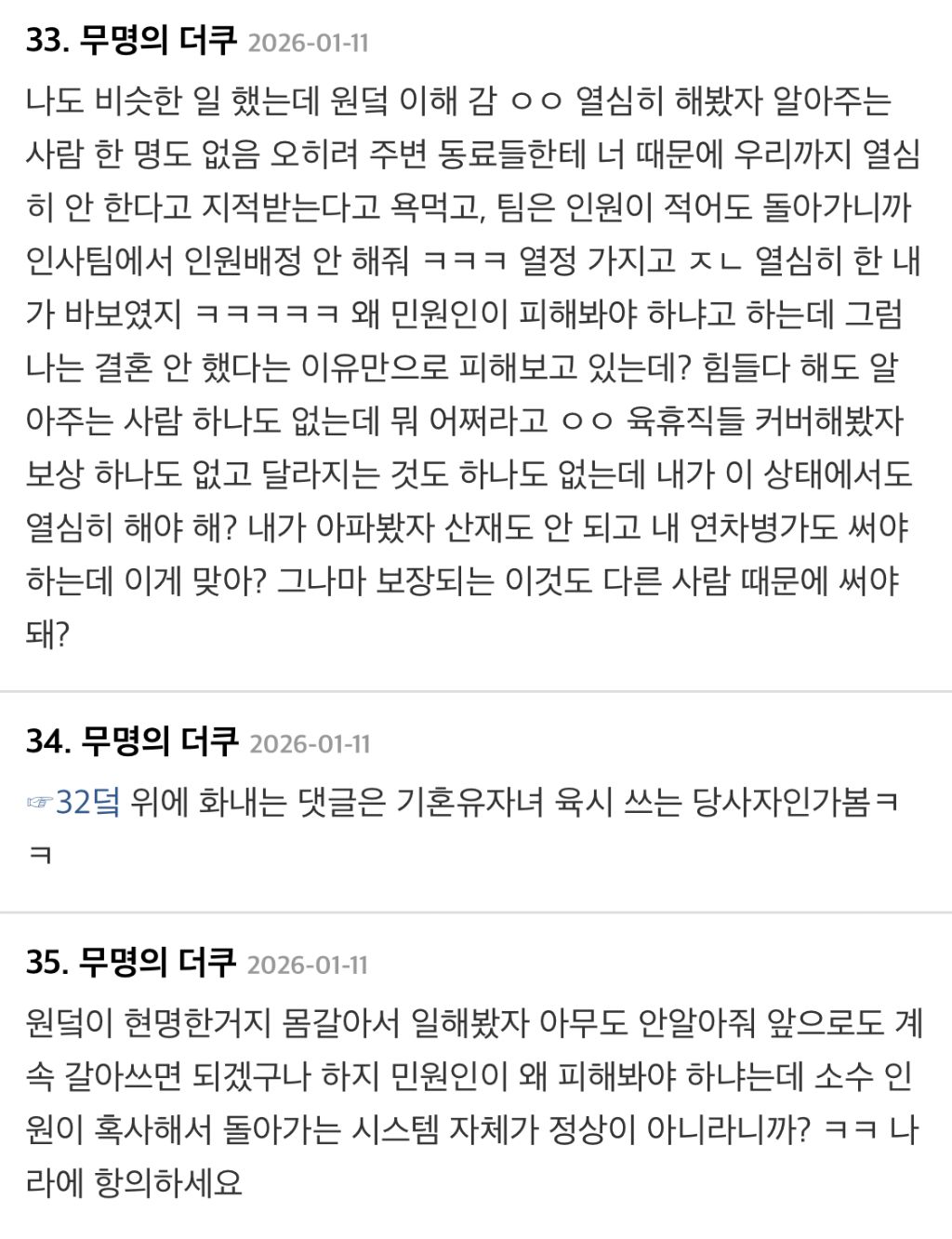 작성자2026년???? 작성시간 26.01.13 육휴로 쉬는 게 당연한 거면 육휴 담당 일 떠맡은 사람이 2인분치 일 못하는 것도 당연한 거 아녀? 사람은 한명인데?