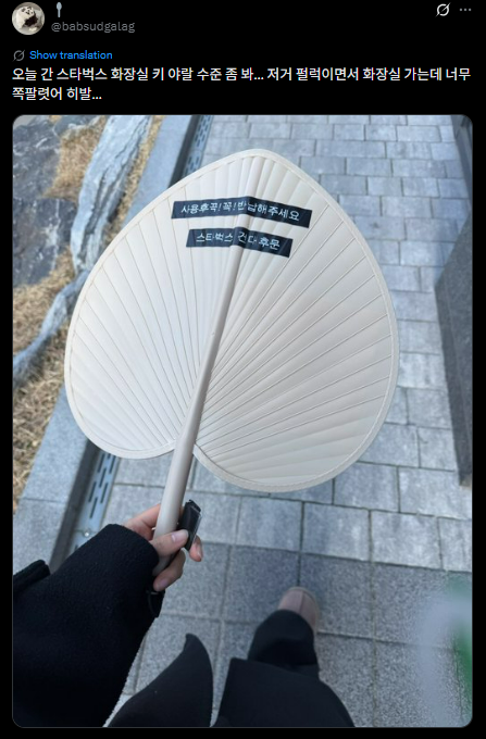 [흥미돋]오늘 간 스타벅스 화장실 키 수준 좀 봐… 저거 펄럭이면서 화장실 가는데 너무 쪽팔렷어… 작성자바나나스플릿구슬|작성시간26.01.13|조회수100,666 목록 댓글 41 글자크기 작게가 글자크기 크게가 출처: https://x.com/babsudgalag/status/2010364888867303479?s=20 다음검색 현재 게시글 추가 기능 열기 북마크 공유하기 신고 센터로 신고 댓글 댓글 41 댓글쓰기 답글쓰기 댓글 리스트 작성자7키로뺄게 | 작성시간 26.01.13 저정도 크기면 그냥 버리고도 갈꺼같음 작성자내 멘탈은 아주 강아지 | 작성시간 26.01.13 아앀ㅋㅋㅋㅋ 몇 개를 잃어버린겨 작성자모카크림빵제빵사 | 작성시간 26.01.13 나 광안리에서 나무도마여서 ㅈㄴ 어리둥절 주변 눈치 보면서 화장실 갔는데 상시로 열려있었음 ㅅㅂ 작성자웃음이많은여시 | 작성시간 26.01.13 아... 오죽하면 흑흑 작성자헛소리 금지 | 작성시간 26.01.13 요술봉 이미지 확대 댓글 전체보기
