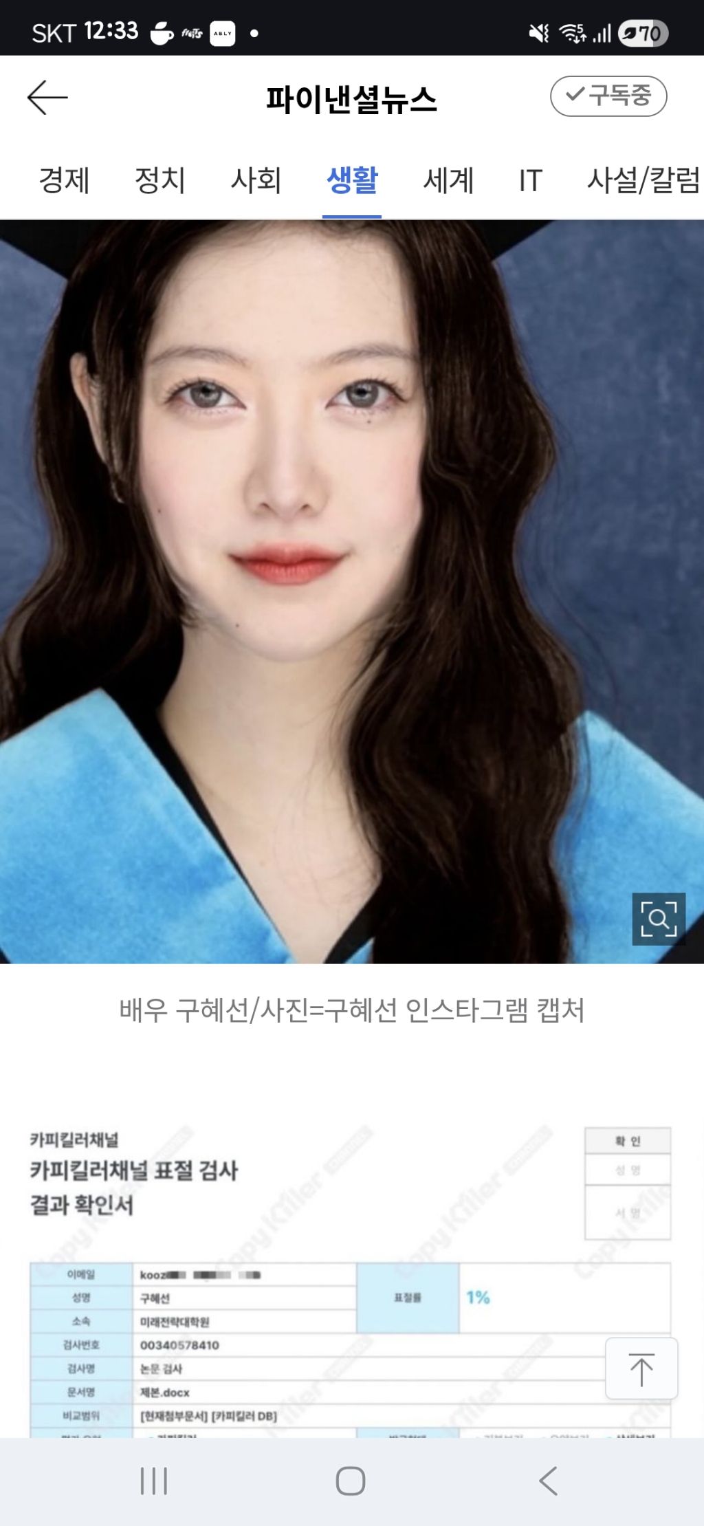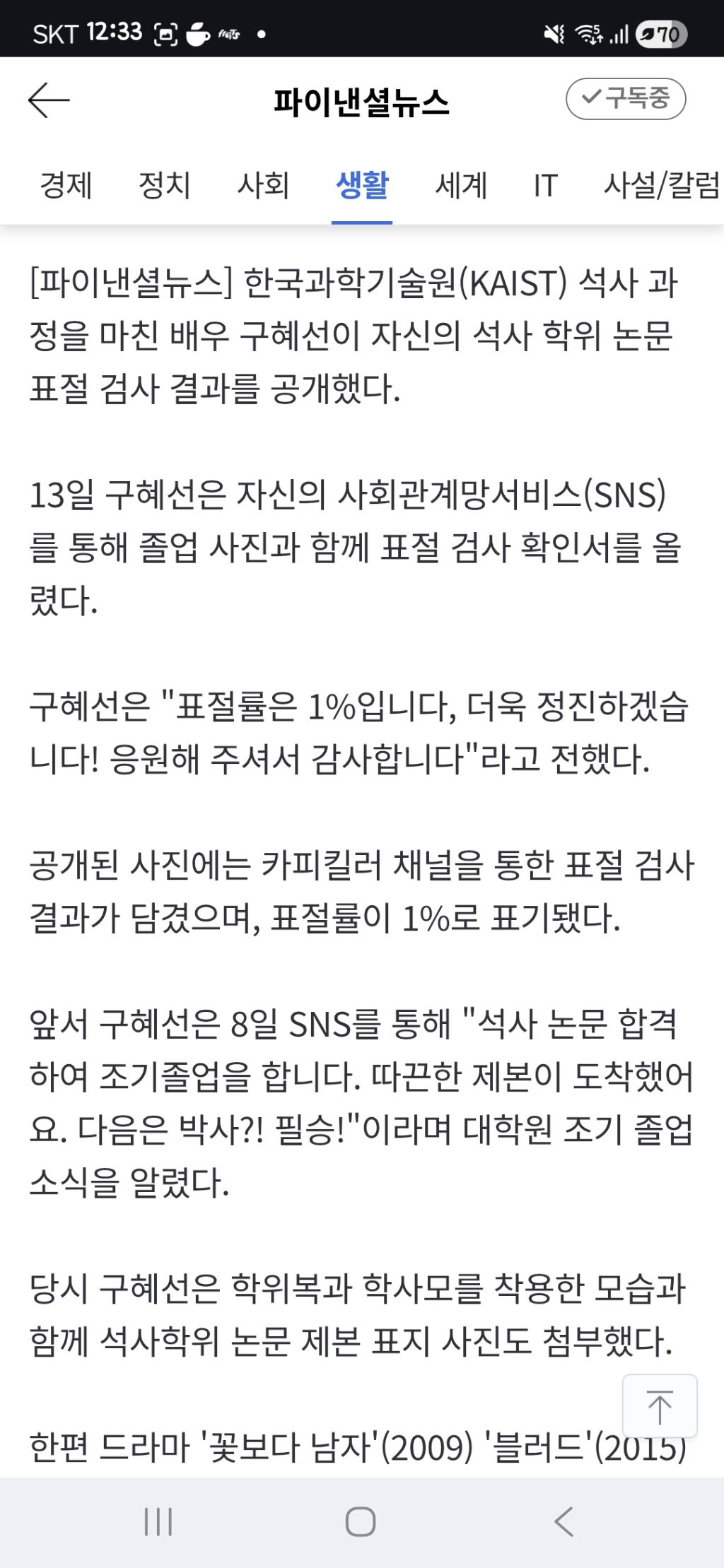 [여시뉴스데스크]'카이스트 조기졸업' 구혜선 "논문 표절률 1%…다음은 박사?!" 작성자지ㄹ도풍년이다진짜|작성시간26.01.13|조회수65,674 목록 댓글 149 글자크기 작게가 글자크기 크게가 출처: https://naver.me/G5PbpLNm'카이스트 조기졸업' 구혜선 "논문 표절률 1%…다음은 박사?!"한국과학기술원(KAIST) 석사 과정을 마친 배우 구혜선이 자신의 석사 학위 논문 표절 검사 결과를 공개했다. 13일 구혜선은 자신의 사회관계망서비스(SNS)를 통해 졸업 사진과 함께 표절 검사 확인n.news.naver.comㅈㅁㅊㅊ논문표절률 1퍼센트라니....다재다능..똑똑..고트혜선..👍🏻 다음검색 현재 게시글 추가 기능 열기 북마크 공유하기 신고 센터로 신고 댓글 댓글 149 댓글쓰기 답글쓰기 댓글 리스트 작성자짱워녕 | 작성시간 26.01.15 멋지다 작성자강쥐있인간 | 작성시간 26.01.15 진심으로 항상 응원함ㅜ 작성자내 멘탈은 아주 강아지 | 작성시간 26.01.15 대박이다 작성자슈퍼 | 작성시간 26.01.15 진짜 멋있음 작성자나의해방 | 작성시간 26.01.17 애초에 연예인보다 이쪽 길 갔음 구설수 없이 더 잘 살았을거 같다 댓글 전체보기