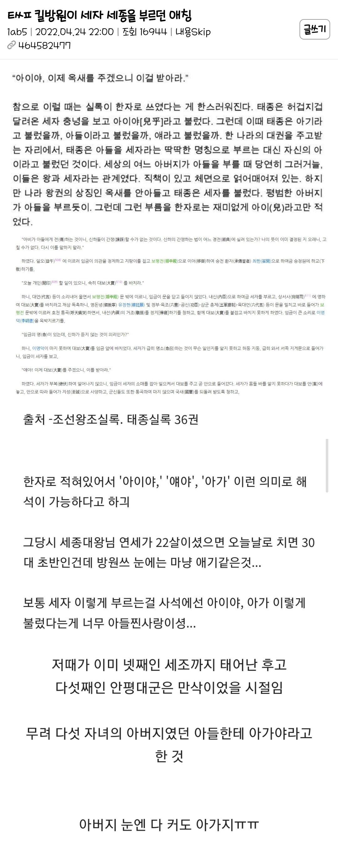 작성자20648 작성시간 26.01.14 아들 세명 연달아 죽고 나서 생긴 애들이라 애지중지할만함 양녕도 그지랄하는 거 봐주고