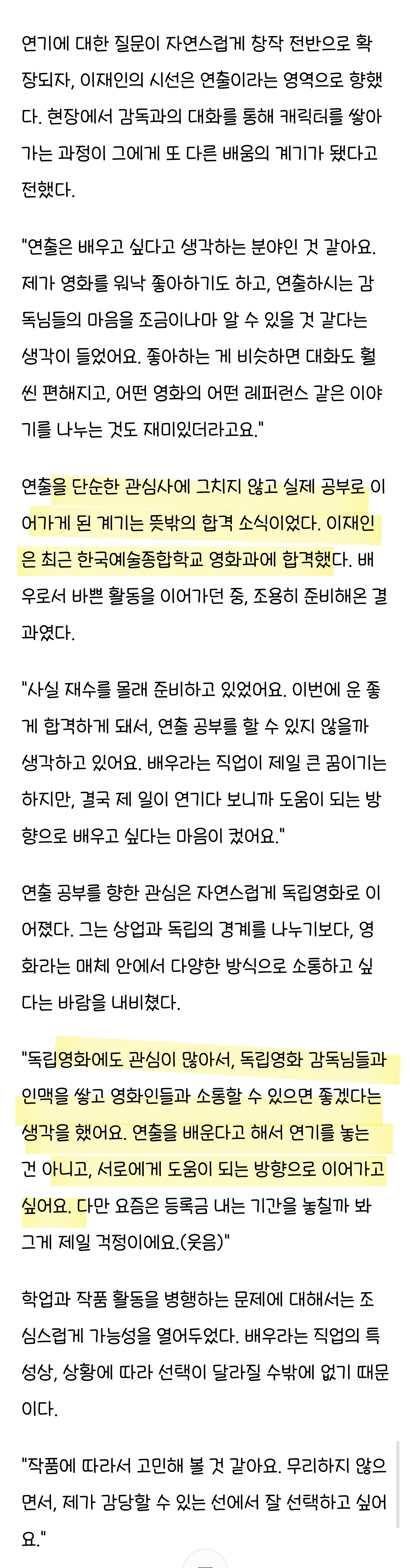 [여시뉴스데스크]'콘크리트 마켓' 이재인, "한예종 합격? 연출 배우고 싶어서 몰래 준비했죠." [인터뷰] 작성자데이지daisy|작성시간26.01.14|조회수12,894 목록 댓글 22 글자크기 작게가 글자크기 크게가 출처: https://sports.hankooki.com/news/articleView.html?idxno=6921213'콘크리트 마켓' 이재인, "한예종 합격? 연출 배우고 싶어서 몰래 준비했죠" [인터뷰] - 스포츠한[스포츠한국 이유민 기자] 배우 이재인은 언제나 또래 배우들과는 다른 궤적으로 성장해왔다. 어린 시절부터 카메라 앞에 섰지만, \'아역 출신\'이라는 수식어에 머무르기보다 매 작품마다 자신sports.hankooki.com 전문 출처로 다음검색 현재 게시글 추가 기능 열기 북마크 공유하기 신고 센터로 신고 댓글 댓글 22 댓글쓰기 답글쓰기 댓글 리스트 작성자I의게임 | 작성시간 26.01.14 재인쓰 연기잘해.. 믿고본다 나중에 연출작품도 볼수잇길 작성자아리엘 후라도 | 작성시간 26.01.14 재인이 앞으로가 더 기대됨 ㄹㅇ 작성자옥화성 | 작성시간 26.01.14 라켓소년단에서 너무 좋아했다 작성자GANNI | 작성시간 26.01.14 좋아해 작성자아이유여친 | 작성시간 26.01.14 오래보고싶어 넘 기대됨 댓글 전체보기
