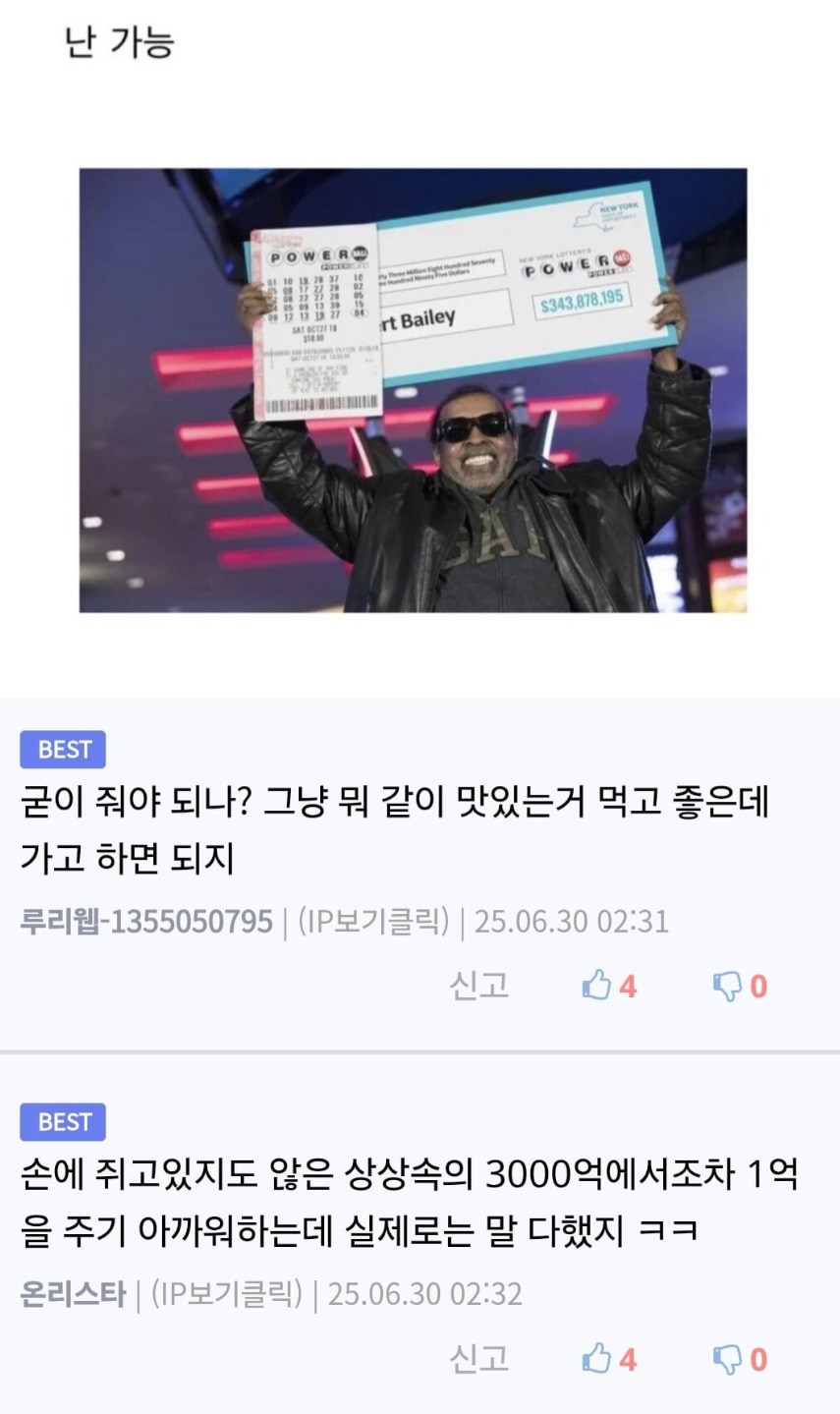 [흥미돋]3000억 짜리 복권 당첨되면 친구한테 1억 줄 수 있어?.jpg 작성자Car페인중독|작성시간26.01.14|조회수30,352 목록 댓글 309 글자크기 작게가 글자크기 크게가 출처: https://theqoo.net/square/4060947782 다음검색 현재 게시글 추가 기능 열기 북마크 공유하기 신고 센터로 신고 댓글 댓글 309 댓글쓰기 답글쓰기 댓글 리스트 작성자말하는대로오 | 작성시간 26.01.15 가넝!! 작성자돈빌려주지말기 | 작성시간 26.01.15 친구가없어 작성자일류미나띠 | 작성시간 26.01.15 당연 작성자맘수터치 | 작성시간 26.01.16 가능은한데 굳이..? 작성자고양이지킴이 | 작성시간 26.01.19 안줌 1/3000이 아까워서가 아니라 서열생김 댓글 전체보기