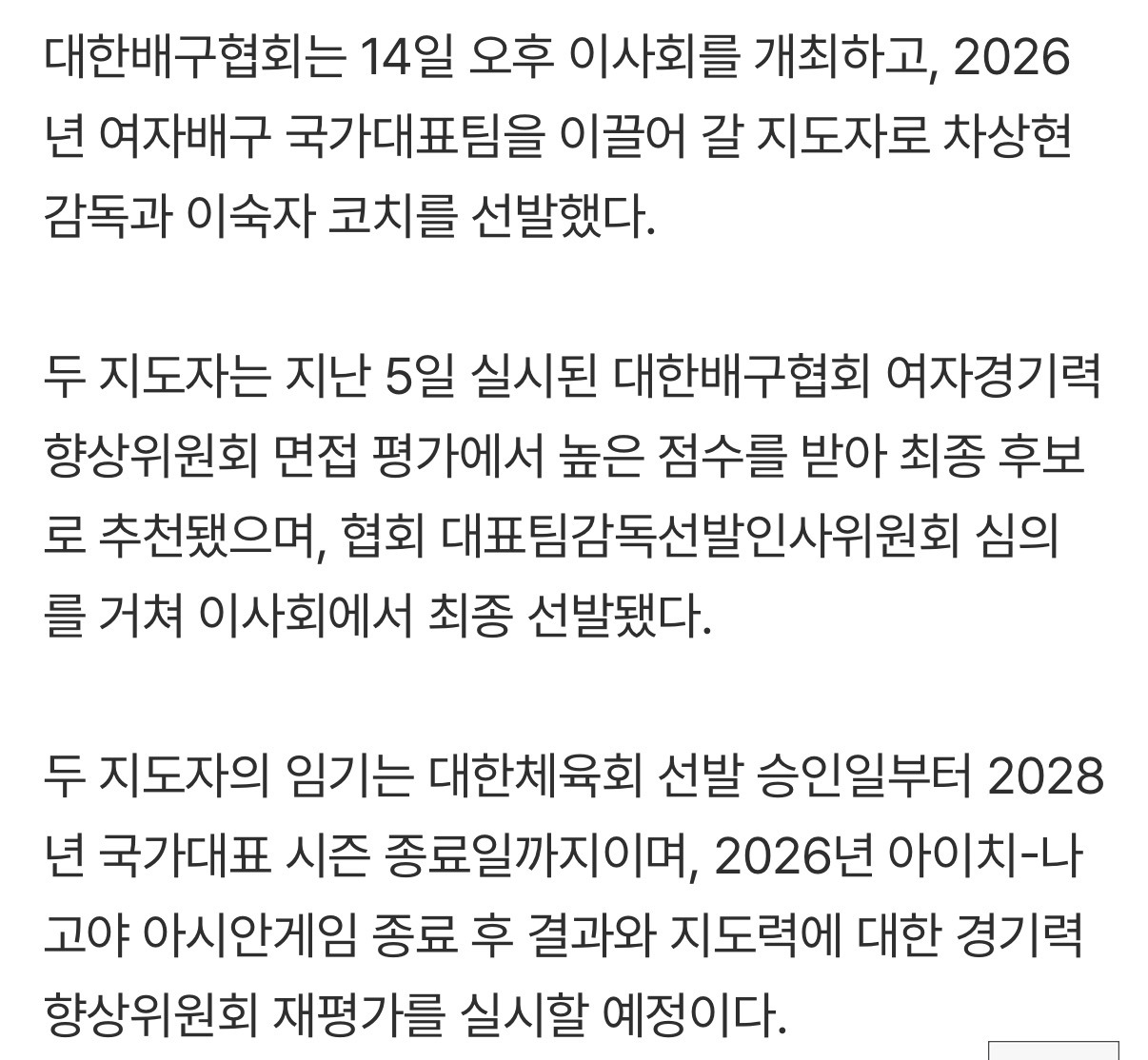 [여시뉴스데스크]女 배구 대표팀 새 지휘봉, 차상현 감독·이숙자 코치 선임 작성자슈퍼펭귄시리얼|작성시간26.01.14|조회수4,106 목록 댓글 73 글자크기 작게가 글자크기 크게가 출처: https://m.sports.naver.com/volleyball/article/079/0004105173女 배구 대표팀 새 지휘봉, 차상현 감독·이숙자 코치 선임여기를 눌러 링크를 확인하세요m.sports.naver.com 다음검색 현재 게시글 추가 기능 열기 북마크 공유하기 신고 센터로 신고 댓글 댓글 73 댓글쓰기 답글쓰기 댓글 리스트 작성자대북일한화문현빈 | 작성시간 26.01.14 왜저래ㅜ진짜 작성자벨레몬 | 작성시간 26.01.14 ㅆㅂ 그랗게 인물이 없냐 작성자latteluver | 작성시간 26.01.14 코보 개같은협회 시발 작성자다음주 로또 1등은 나 | 작성시간 26.01.15 아 쌰발 작성자뚜뚜베이비 | 작성시간 26.01.15 미친 댓글 전체보기
