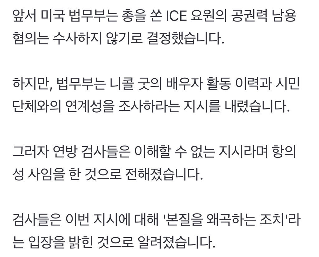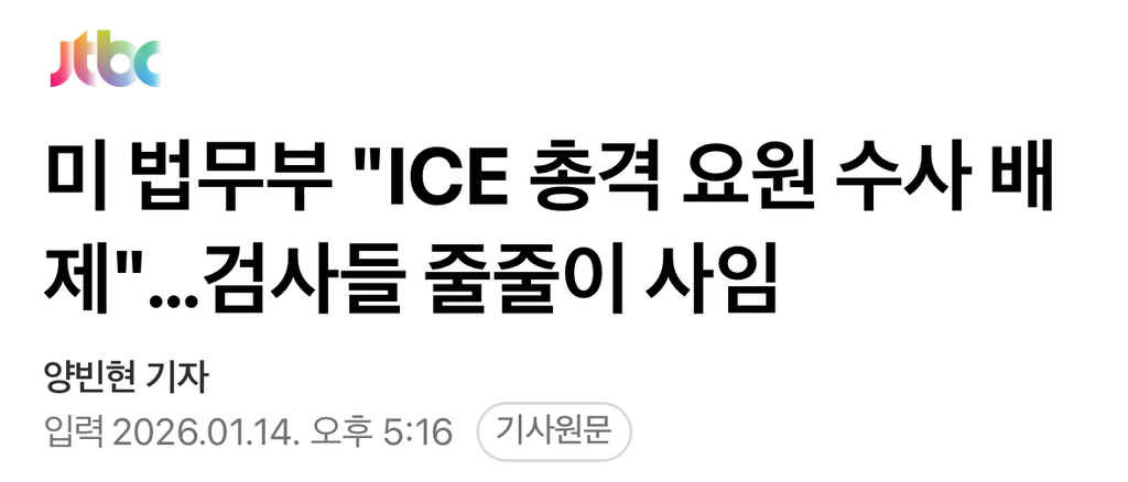[여시뉴스데스크]미 법무부 "ICE 총격 요원 수사 배제"…검사들 줄줄이 사임 작성자소리앙|작성시간26.01.14|조회수4,993 목록 댓글 9 글자크기 작게가 글자크기 크게가 출처: https://naver.me/FeNiyrjS미 법무부 "ICE 총격 요원 수사 배제"…검사들 줄줄이 사임미국 미네소타주에서 이민세관단속국 요원의 총격에 맞아 숨진 르네 니콜 굿 사건 관련해 미국 검사들이 단체로 사직하고 있습니다. 당시 사건에 연루된 ICE 요원은 조사하지 않으면서, 사망한 n.news.naver.com전문출처 다음검색 현재 게시글 추가 기능 열기 북마크 공유하기 신고 센터로 신고 댓글 댓글 9 댓글쓰기 답글쓰기 댓글 리스트 작성자사측이세요물음표 | 작성시간 26.01.14 살인면허 쥐어줬네ㅋㅋ 작성자이제는여시를그만할때 | 작성시간 26.01.14 미국도 살곳이 못되는구나… 작성자불닭마요참치볶음 | 작성시간 26.01.14 일단 죽여 놓고 이유를 찾는다는거야?내가 잘못 이해한건가? 작성자욕 줄이기 | 작성시간 26.01.14 저기 검사들은 소신이 있네 작성자요추염좌최악임조심하셈 | 작성시간 26.01.14 법무부 ㅈ같네 댓글 전체보기