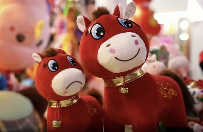 중국 동부의 한 장난감 공장에서 봉제 실수로 발생한 슬픈 표정의 말 인형이